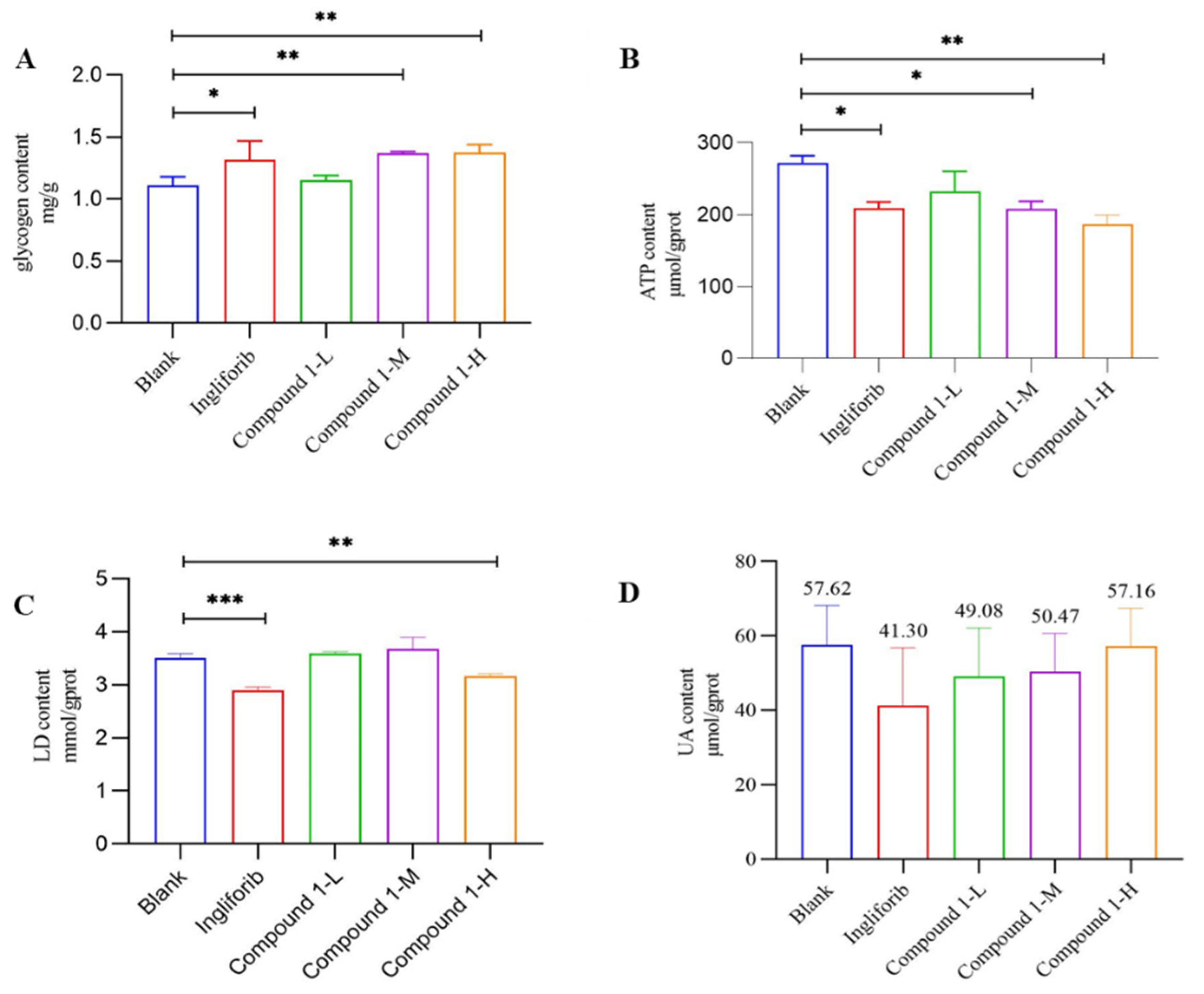 2.2.4. The Effect of Compound 1 on Uric Acid in Muscles