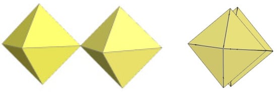 In the study of the imidazole–TiF4-HF system, single crystals of the compound [ImH]8−n[X]n[Ti8F36][Ti6F28] were grown [23]. Its crystal structure contains two different perfluoridotitanate (IV) anion–cubic [Ti8F36]4− octamers and a hexameric [Ti6F28]4− anion. Unfortunately, it was not possible to accurately determine all cations in the crystal structure, but the proposed models of the anions are well refined. The [Ti6F28]4− anion has a very unusual geometry (Figure 19). In the centre are two TiF6 octahedra that share a vertex. Attached to this pair is a TiF6 unit that shares a fluorine atom with each of the octahedra. There is also a chain of three TiF6 octahedra in which each octahedron at the end of the chain shares two vertices with two octahedra in the centre of the [Ti6F28]4− anion.