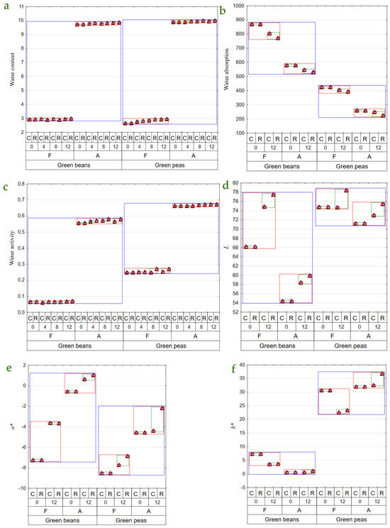 Mean values of: (a)—water content (g × 100 g d.f.−1); (b)—water absorption (g × 100 g d.w.−1); (c)—aw; (d)—color parameter L; (e)—color parameter a*; (f)—color parameter b*); (g)—vitamin E content (mg × 100 g d.w.−1); (h)—vitamin C content (mg × 100 g d.w.−1); (i)—total chlorophyll content (mg × 100 g d.w.−1); (j)—total carotenoid content (mg × 100 g d.w.−1); (k)—β—carotene content (mg × 100 g d.w.−1); (l)—total polyphenol content (mg (+)catechin × 100 g d.w.−1); (m)—antioxidant activity against a radical DPPH (μmol Trolox equivalent × g d.w.−1) in vegetable green beans and green peas (blue line), depending on the method of drying (F—freeze-drying; A—air-drying; red line), storage period (0, 4, 8, 12 months), and temperature of storage (C—2–4 °C; R—18–22 °C; green line).