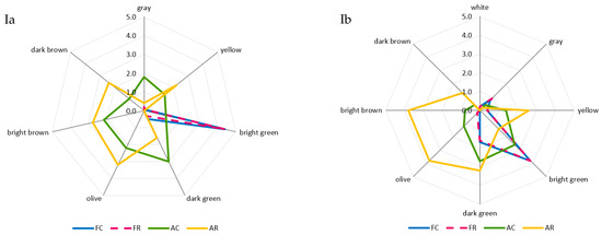 There were no changes in L parameter values in PFC and PAC (Figure 1d). The same observation was made by Michalik and Dobrzański [42] during a 3-month storage of air-dried dill, celery, and parsley leaves. In addition, a statistically significant color brightening was demonstrated after the 12-month storage for freeze-dried and air-dried green beans. Immediately after drying, the freeze-dried materials had a lighter color than the air-dried ones. Cao et al. [43] noted similar changes in air-dried broccoli. Storage under room conditions facilitated greater color brightening of the dried materials.
