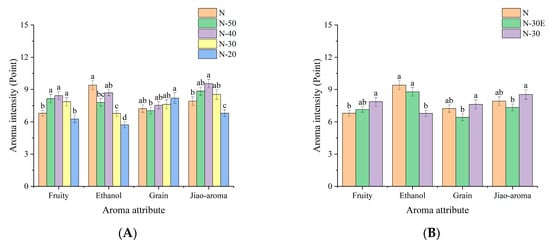 Column chart of the intensity of aroma attribute in N, N-50, N-40, N-30 and N-20 (A), and N, N-30E and N-30 (B) (a–d: Superscripts of the same letter within an attribute indicate no significant difference by Fisher’s least significant difference (LSD) test at α = 0.05).