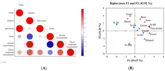 The Spearman correlation heatmap between four aroma attributes, ethanol concentration, and other substances concentration (A); The PCA bi-plot generated from the sensory descriptors (B).