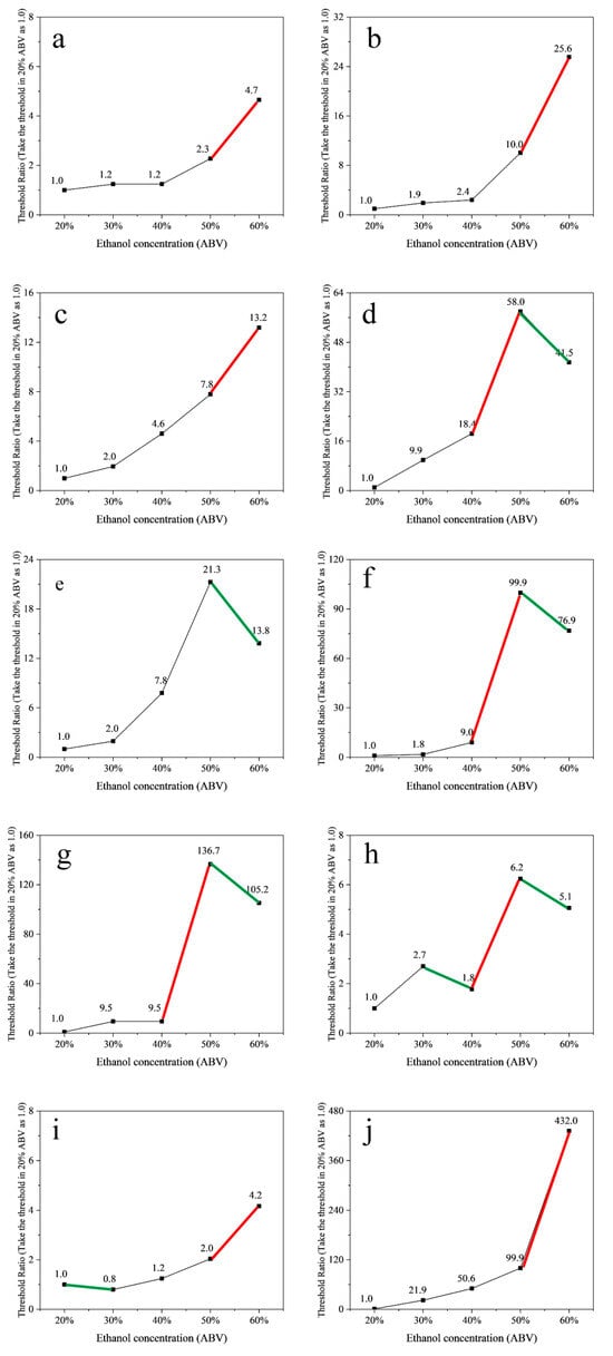 Scatter plots of thresholds ratio in five ethanol levels of ethyl acetate (a), ethyl hexanoate (b), ethyl heptanoate (c), 1-pentanol (d), 1-hexanol (e), damascenone (f), 1-nonanal (g), γ-dodecalactone (h), dimethyl trisulfide (i), and (±)-geosmin (j). (The red line presents a downward trend in the threshold when the alcohol content increased, and the green line the interval in which the threshold for each compound is sharply increased).