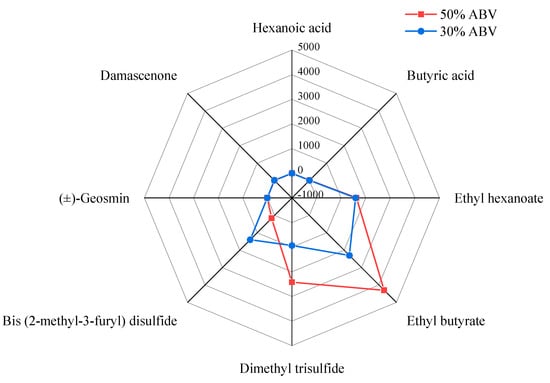 When the Baijiu was diluted with water, the content of alcohol and aroma compounds changed regularly. However, the thresholds of aroma compounds changed irregularly, which led to the change in the aroma compounds’ OAV changing differently (Table 4). And in order to show the change of compounds aroma contribution, a total of 14 compounds, including ethyl propionate, ethyl heptanoate, ethyl caprylate, ethyl caprate, propionic acid, butyric acid, valeric acid, hexanoic acid, 2-methyl-1-butanol, 1-hexanol, linalool, damascenone, (±)-geosmin, and 4-ethyl-2-methoxyphenol, were used as examples in this study. And their concentrations in Baijiu were referred to previous studies [,]. As shown in Table S3, when the Baijiu sample was diluted by ultrapure water from 50% to 30% ABV, the concentration of each compound gradually decreased. However, due to the different properties of each compound, the threshold of each compound is affected by the ethanol concentration to varying degrees, resulting in different changes in the OAV of each compound. The OAV% of each compound was calculated by dividing the OAV of each compound by the total OAV, which can, to some extent, represent the contribution rate of each substance’s aroma. As shown in Figure 5, the compound with the highest aroma contribution in 30% ABV was damascenone instead of ethyl heptanoate in 50% ABV. Additionally, the profile of the aroma contribution changed as well. In the 50% ABV, the aroma contributions of 11 compounds were relatively balanced. However, in the 30% ABV, the aroma contributions of damascenone were extremely higher than others, which were up to 38%. When the Baijiu was diluted with water, the role of compounds in the aroma profile of Baijiu changed, leading to irregular variations in the intensities of aroma attributes in Baijiu.