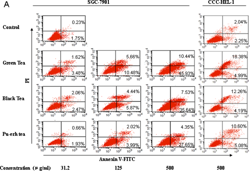 Flow cytometric analysis of cell apoptosis induced by treatment for 48 h in SGC-7901 and CCC-HEL-1 cells. (A) Apoptotic cells after treatment with three tea extracts at concentrations of 31.2, 125 and 500 μg/mL in SCG-7901 cells and 500 μg/mL in CCC-HEL-1 cells; (B) Apoptotic cells after treatment with tea constituents at the concentrations of 10, 50 and 250 μg/mL in SCG-7901 cells and 250 μg/mL in CCC-HEL-1 cells.