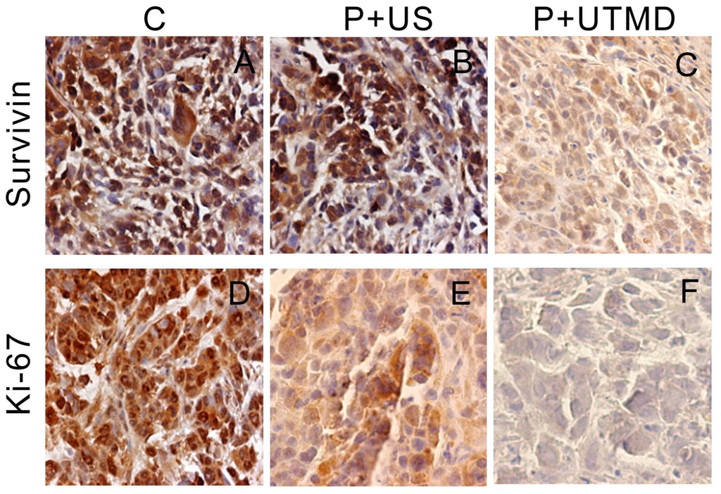The scores of Survivin expression in control group (4.33 ± 0.69) and P+US group (4.11 ± 0.67) were higher than that of UTMD group (1.27 ± 0.57) significantly (both p < 0.01). Scores of Ki-67, PCNA protein expression of control group were (4.06 ± 0.73) and (3.83 ± 0.62), and that of (P + US group were (3.22 ± 0.88) and (3.39 ± 0.61). In P + UTMD group, scores of Ki-67, PCNA protein expression of were (1.22 ± 0.43) and (1.56 ± 0.51), respectively. As compared with P + US group and control group, the difference was significant (p < 0.01). As showed in Figure 2, some part of the tumor sample displayed no Survivin or Ki-67 protein expression, indicating that UTMD-based shRNA delivery system could effectively silence the Survivin gene expression and inhibit cell proliferation.