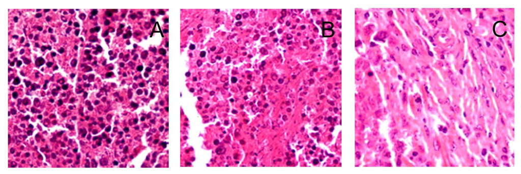 Serial sections of tumor tissue were processed for histological examination. The specimens were washed with PBS to remove blood, fixed with formaldehyde, dehydrated with a graded alcohol series, and embedded in paraffin. Hematoxylin eosin staining (H & E) was performed on the specimens, for histopathologic evaluation of hemorrhage, necrosis, and inflammation.