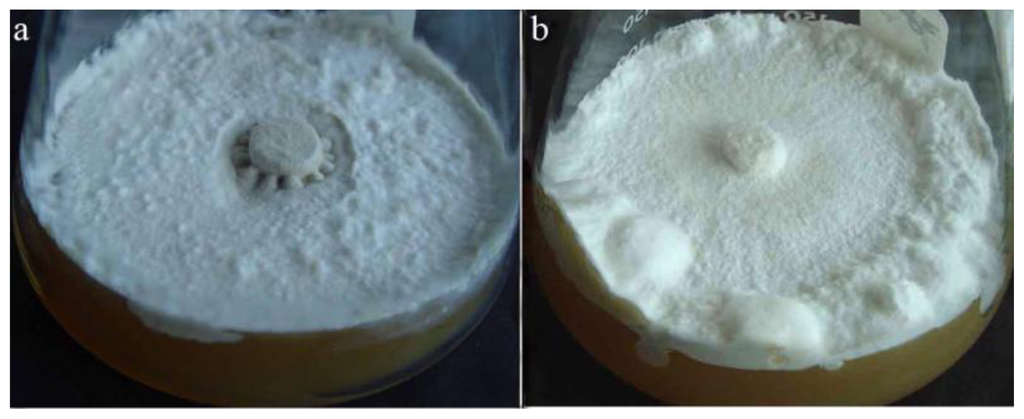 The fructose complete medium was composed of fructose 20.0 g L−1, peptone 4.0 g L−1, MgSO4·7H2O 0.5 g L−1, KH2PO4 0.5 g L−1, K2HPO4 1.0 g L−1, vitamin B1 0.05 mg L−1 and agar 10.0 g L−1. The initial pH value was adjusted to 7.0 before the agar was added, and then the medium except for vitamin B1 was autoclaved. Vitamin B1 was sterilized by filtration through a 0.22 μm Millipore filter and then added evenly to the autoclaved medium [3]. The medium was poured into the conical flask. Mycelial plugs of 8 mm in diameter obtained from the actively-growing colonies in the petri dishes were transferred to the center of each conical flask containing 20 mL of solid agar medium at 25 °C under dark conditions.