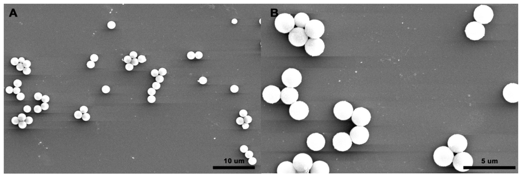 In this paper, poly(glycidyl methacrylate) (PGMA) was chosen as the cladding object, due to its high reactivity caused by superficial epoxy groups and good resistance to acid, heat, weather and solvent. Multifunctional hybrid microspheres with magnetic, antibacterial and fluorescent function were obtained using a PGMA template, as shown in Figure 1. The as-synthesized microspheres could be effectively recovered, due to their magnetic character, and they could be used in several areas, such as biological imaging and biological monitoring, because of their fluorescent property. For an antimicrobial test, Staphylococcus aureus (S. aureus), Bacillus subtilis (B. subtilis), Escherichia coli (E. coli) and Pseudomonas aeruginosa (P. aeruginosa) were used as model bacteria, and hybrid microspheres exhibited distinguishable antibacterial activity against all of them.