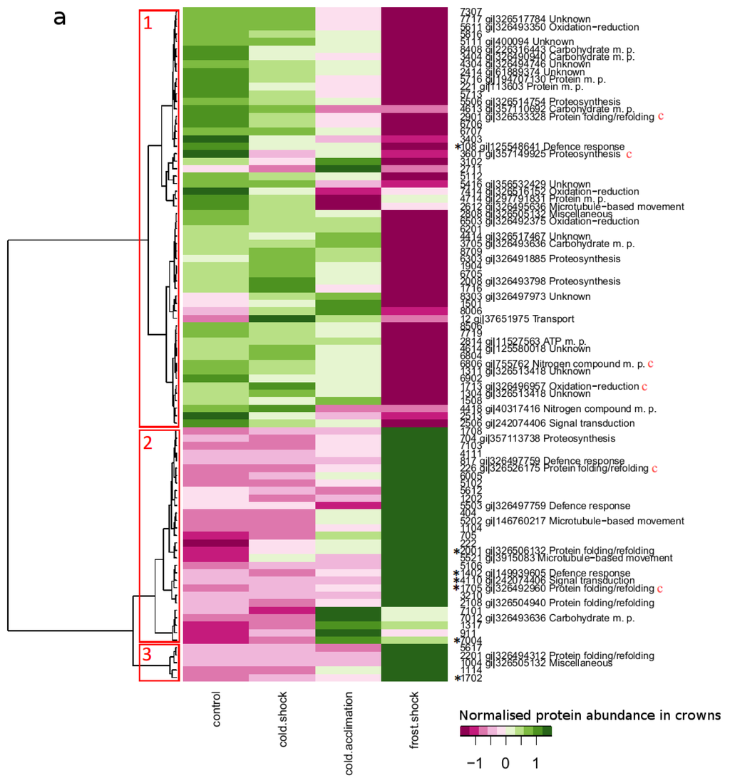 Hierarchical cluster analysis sorted differently accumulated proteins to three clusters in crowns and five clusters in leaves (Tables 1 and 2, Figures 3 and 4, Table S1 in Supplementary data). Proteins of which abundances were predominantly increasing in course of low temperature exposure were found in Cluster 1 in leaves (27 proteins/15 identified) and Cluster 2 in crowns (29 proteins/12 identified), the continuously mounting abundance suggests their importance in all phases of cold hardening process. Among these proteins, there are, e.g., HSP70 in crowns and ATP-dependent zinc metalloprotease FTSH 2 in leaves with documented relation to cold stress [6,28].