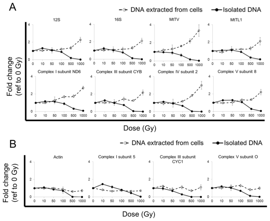For example, a ~100% and 250% increase in Complex III subunit CYB and Complex IV subunit 2 genes, respectively, could be detected at 100 Gy. In contrast, the rest of the tested mitochondrial genes at the same dose of 100 Gy showed only a very small increase (~3% to 16%). qPCR yield is known to inversely relate to the severity of DNA damage [16–19]; thus, decreases in yield were seen at 500 to 1000 Gy (Figure 1A; solid lines).