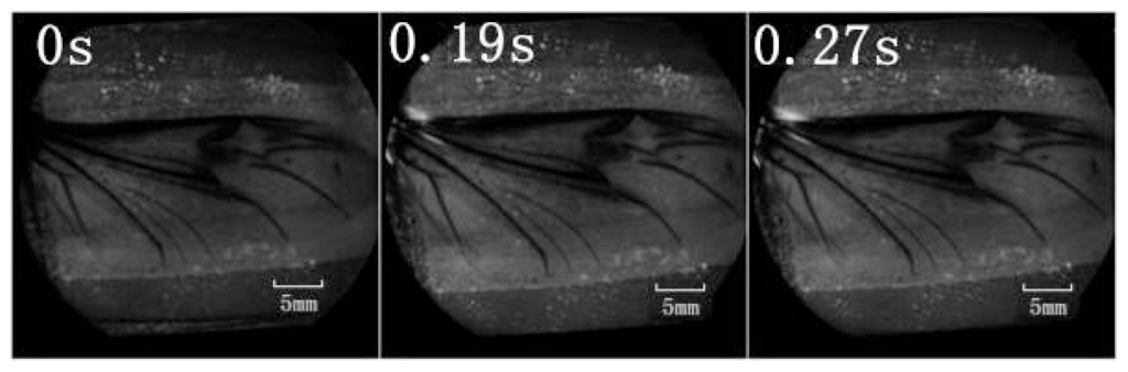 To confirm which veins of the hind wings were involved in the hydraulic mechanism during unfolding, a retinal camera (TOPCON, TRC-50DX-Type IA, Topcon Corp., Tokyo, Japan) was used. Retinal camera testing was performed with a fluorescent agent to color the walls of the veins. One milliliter of green fluorescent indicator (FITC) was injected in beetle abdomen at time 0 (Figure 4). The measurement was taken with an excitation wavelength of 488 nm in retinal camera.