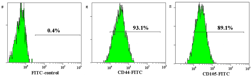 The 3rd generation of stem cells was harvested, and washed once with phosphate-buffered saline(PBS). Cells (1 × 105 per sample) were stained with the following mouse anti-human monoclonal antibody at room temperature for 30 min: anti-CD44-FITC, -CD105-FITC, -CD29-PE, -CD34-PE (Biolegend, San Diego, CA, USA), isotype-identical antibody (Biolegend) served as controls. The cells were washed with PBS two times, and then resuspended in PBS. Fluorescent labeling was analyzed by flow cytometric analysis and CellQuest Pro software (BD Bioscience, Franklin Lakes, NJ, USA).