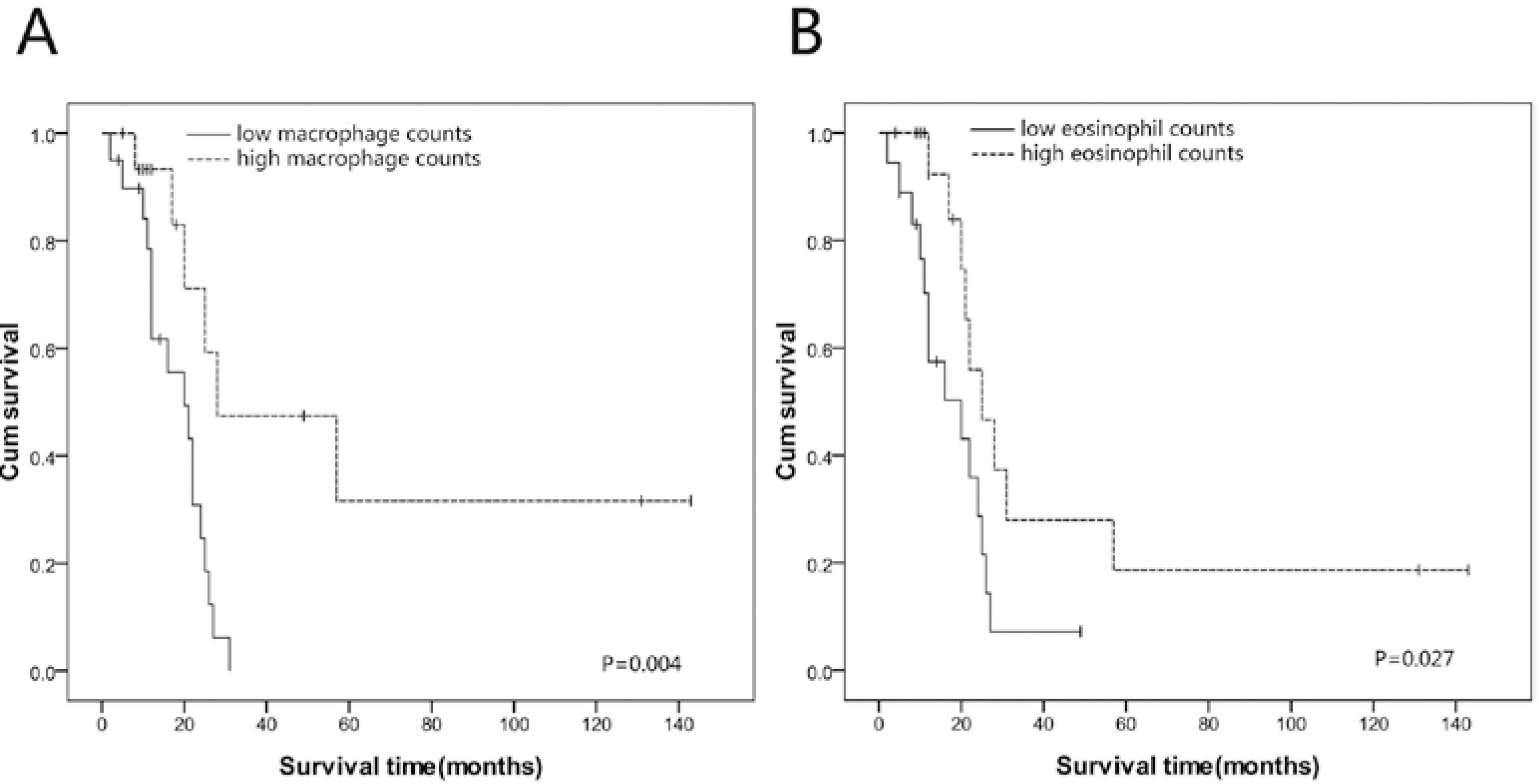 Kaplan-Meier survival curves of SmCEC patients (A) High macrophage counts in SmCEC correlated with better overall survival (p = 0.004); (B) High eosinophil counts in SmCEC correlated with better overall survival (p = 0.027).