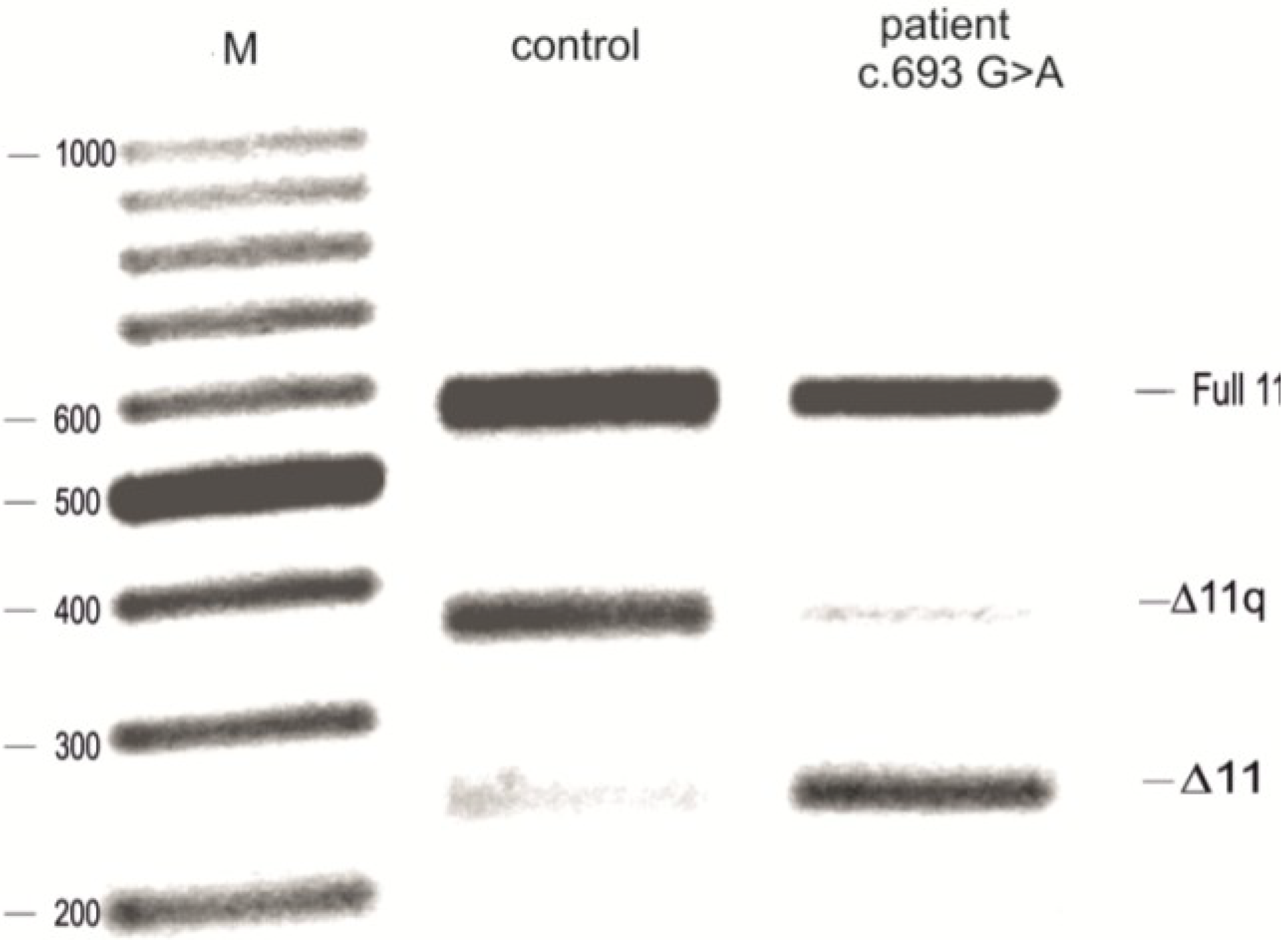 Analysis of BRCA1 cDNA from blood of a patient carrying the variant c.693G>A. Amplification of the cDNA from patient c.693 and the control demonstrated that the variant increases the level of the Δ11 isoform and decreases the Δ11q isoform. M—ladder.