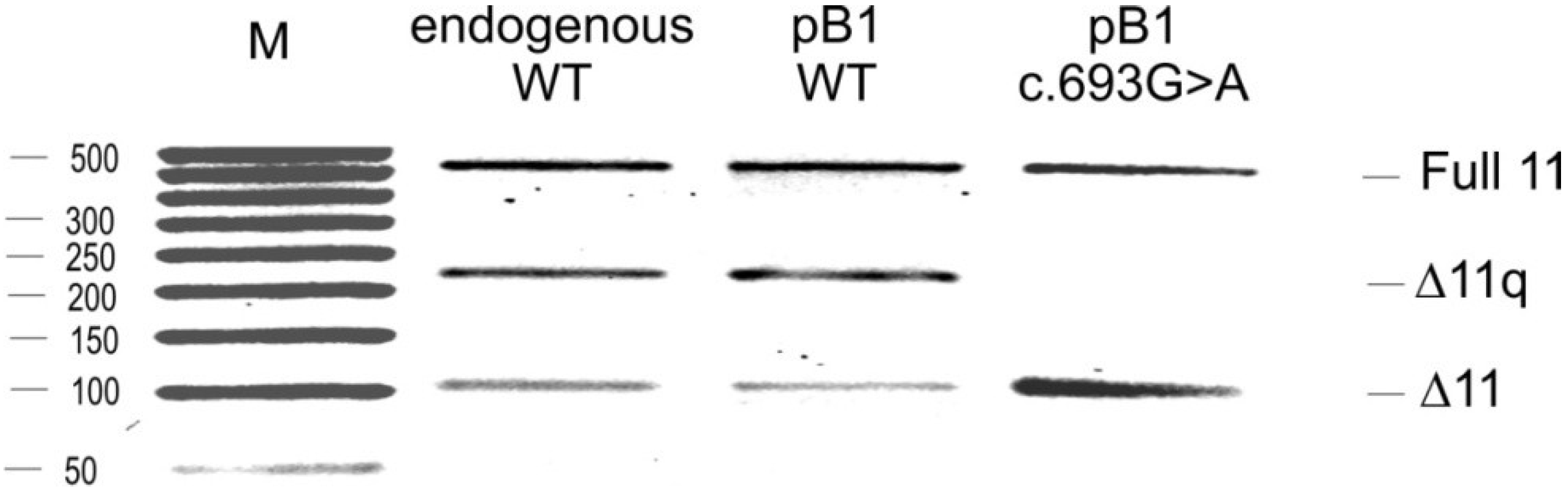 Analysis of BRCA1 minigene. Reverse transcriptase PCR (RT-PCR) (as in Figure 1) from the transfection of endogenous BRCA1 (endogenous wild-type (WT)), the minigene wild-type (pB1WT) and the minigene with the variation (pB1 c.693G>A). To the right of the gel is reported the isoform corresponding to each of the three bands: full-length 11(Full 11), Δ11, Δ11q isoforms. M—ladder.