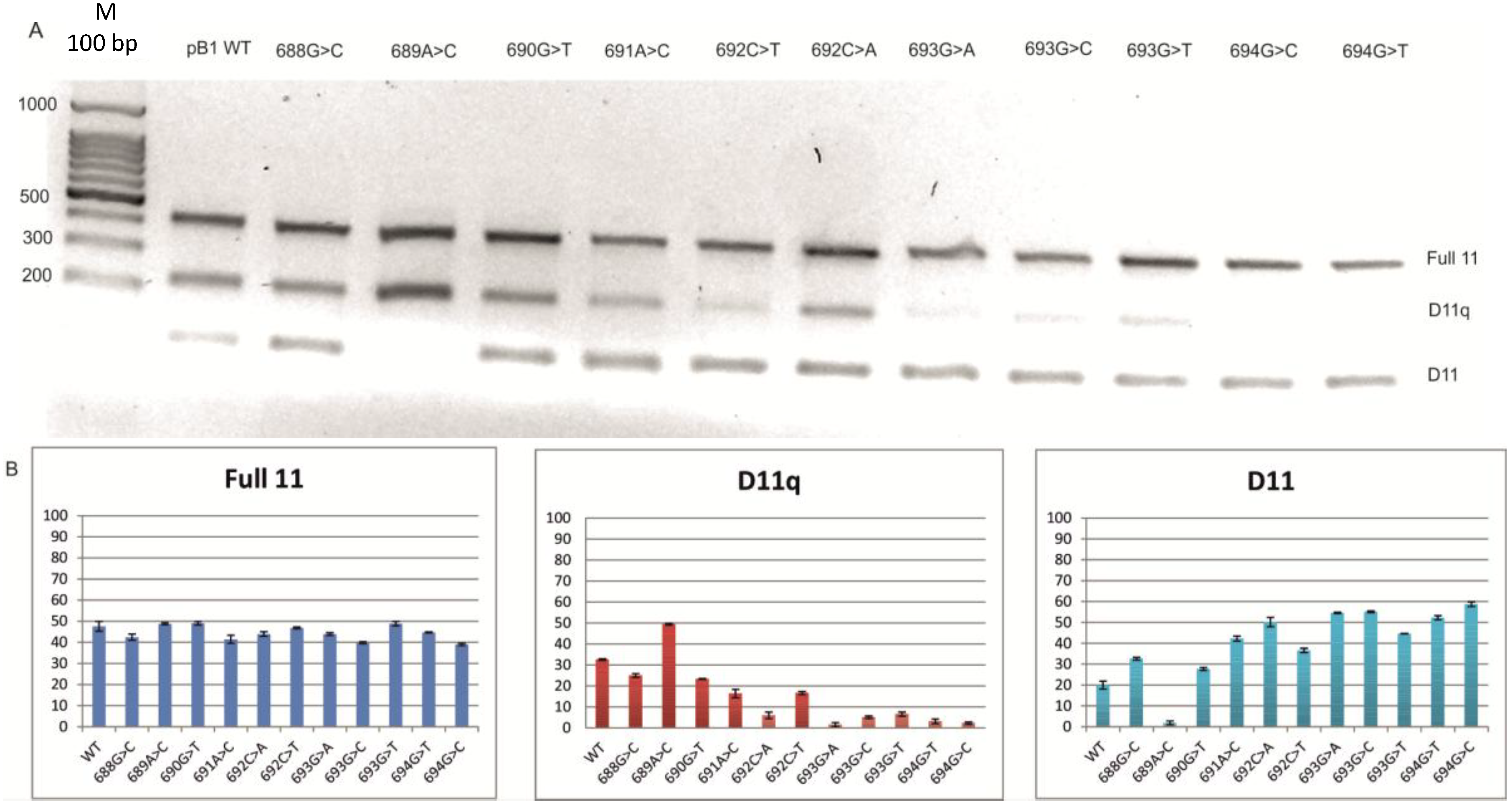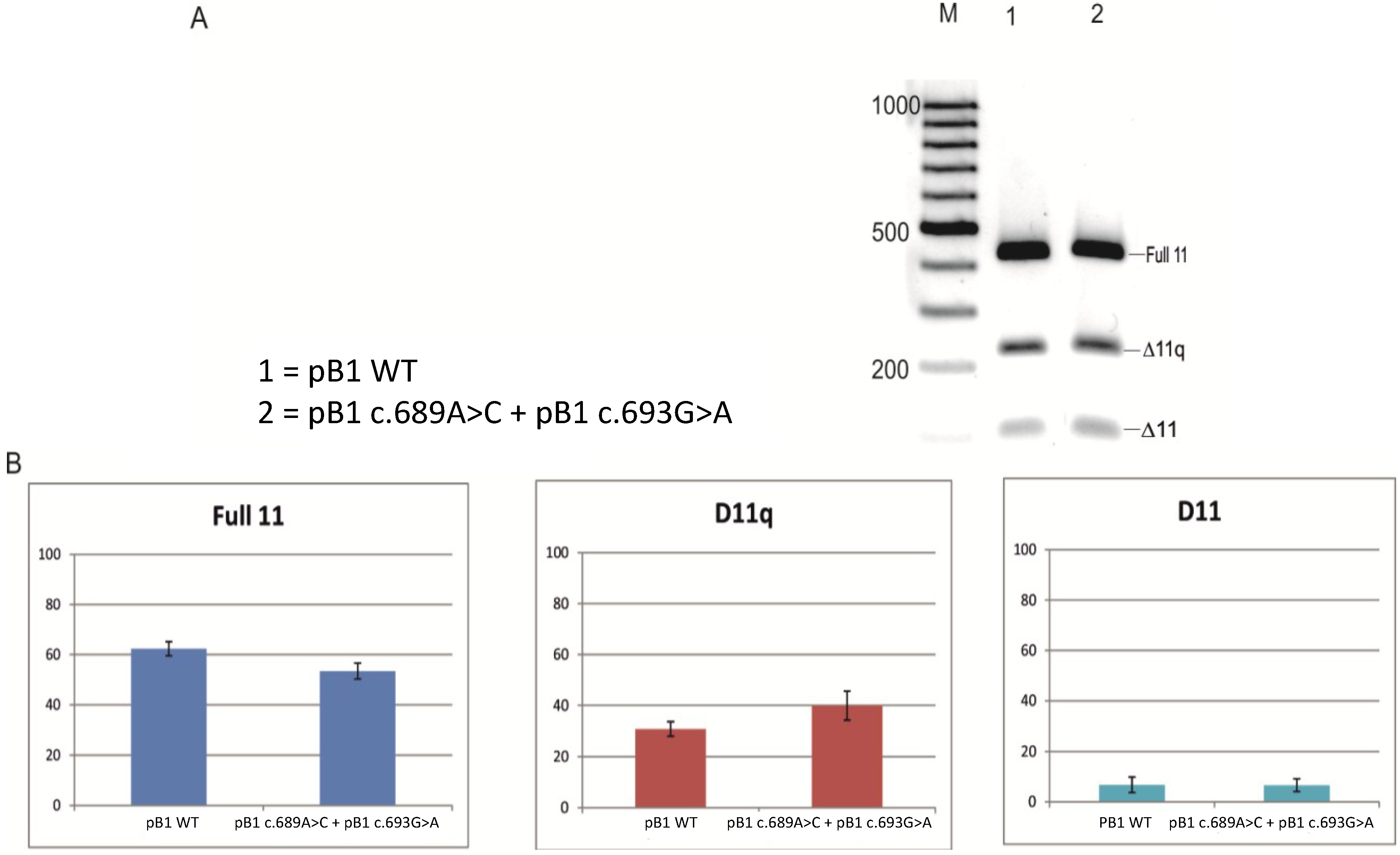 Minigene carrying the double mutant. (A) Splicing product for the pB1 WT minigene (Lane 1) and the minigene with the double mutant (Lane 2). On the right of the gel is a schematic representation of the three splicing isoform corresponding to each of the three bands: the Full 11, the Δ11q and Δ11 isoforms. M is the 100-bp DNA ladder marker; (B) The lower panel shows the percentage (%) of the Full 11, Δ11q and Δ11 isoforms, respectively, calculated against the total expression of the three isoforms. The intensity of the each band was calculated using Image J.