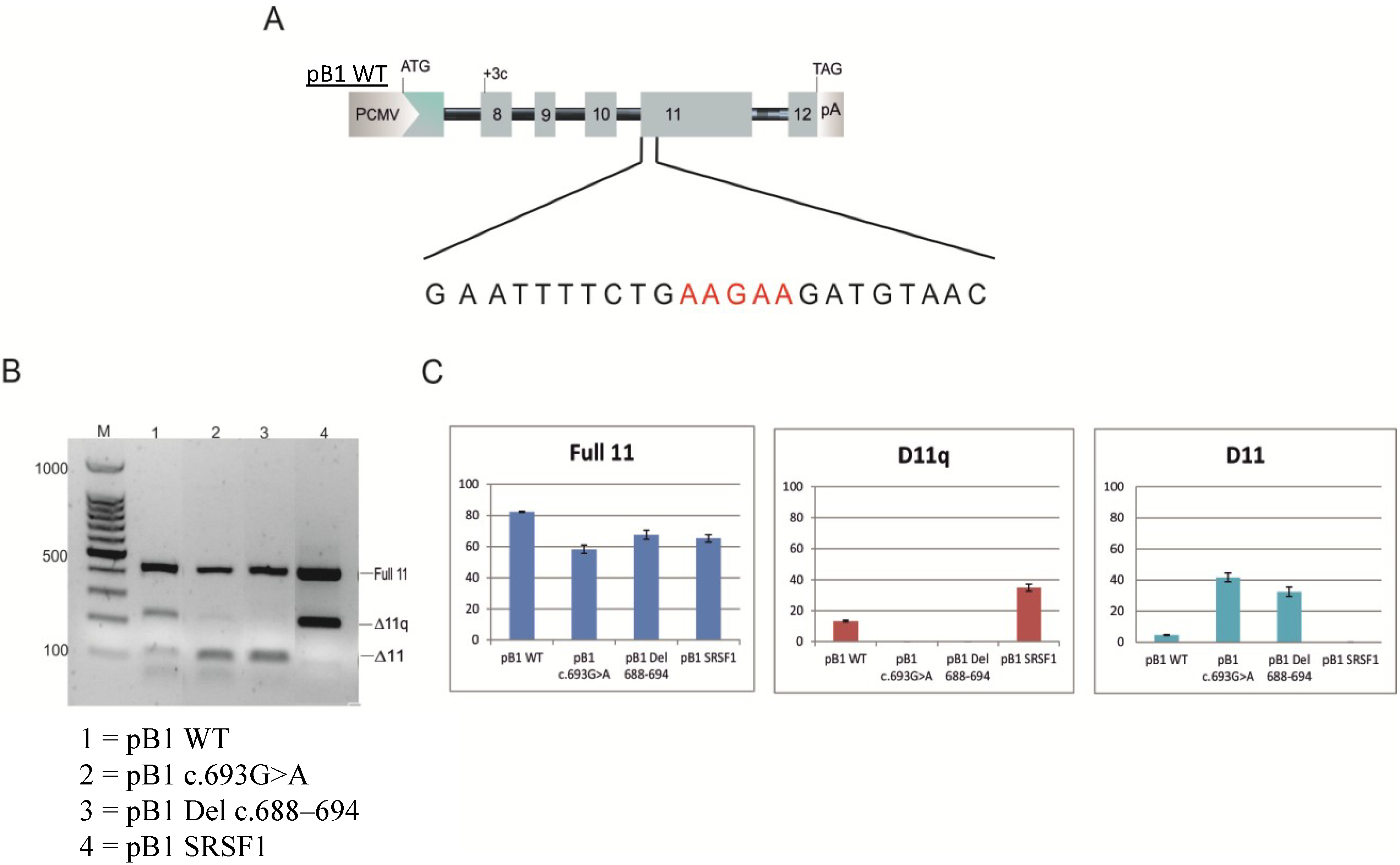 Minigene carrying the deletion c.688–c.694 and the minigene pBSRSF1. (A) The figure shows the minigene pB1WT with the sequence AAGAA (represented in red), which has been replaced in the pB1 SRSF1 minigene; (B) The splicing product for the pB1WT minigene (Lane 1), the minigene carrying the mutation c.693G>A (Lane 2), the pB1 minigene with the deletion of the region between c.688 to c.694 (Lane 3) and the minigene pB1 SRSF1 (Lane 4). On the right of the gel is a schematic representation of the three splicing isoforms corresponding to each of the three bands: the full 11, the Δ11q and the Δ11 isoform. M is the 100-bp DNA ladder marker;and (C) The histogram shows the percentage (%) of the Full 11, Δ11q and Δ11 isoforms, respectively, calculated against the total expression of the three isoforms. The intensity of the each band was calculated using Image J.