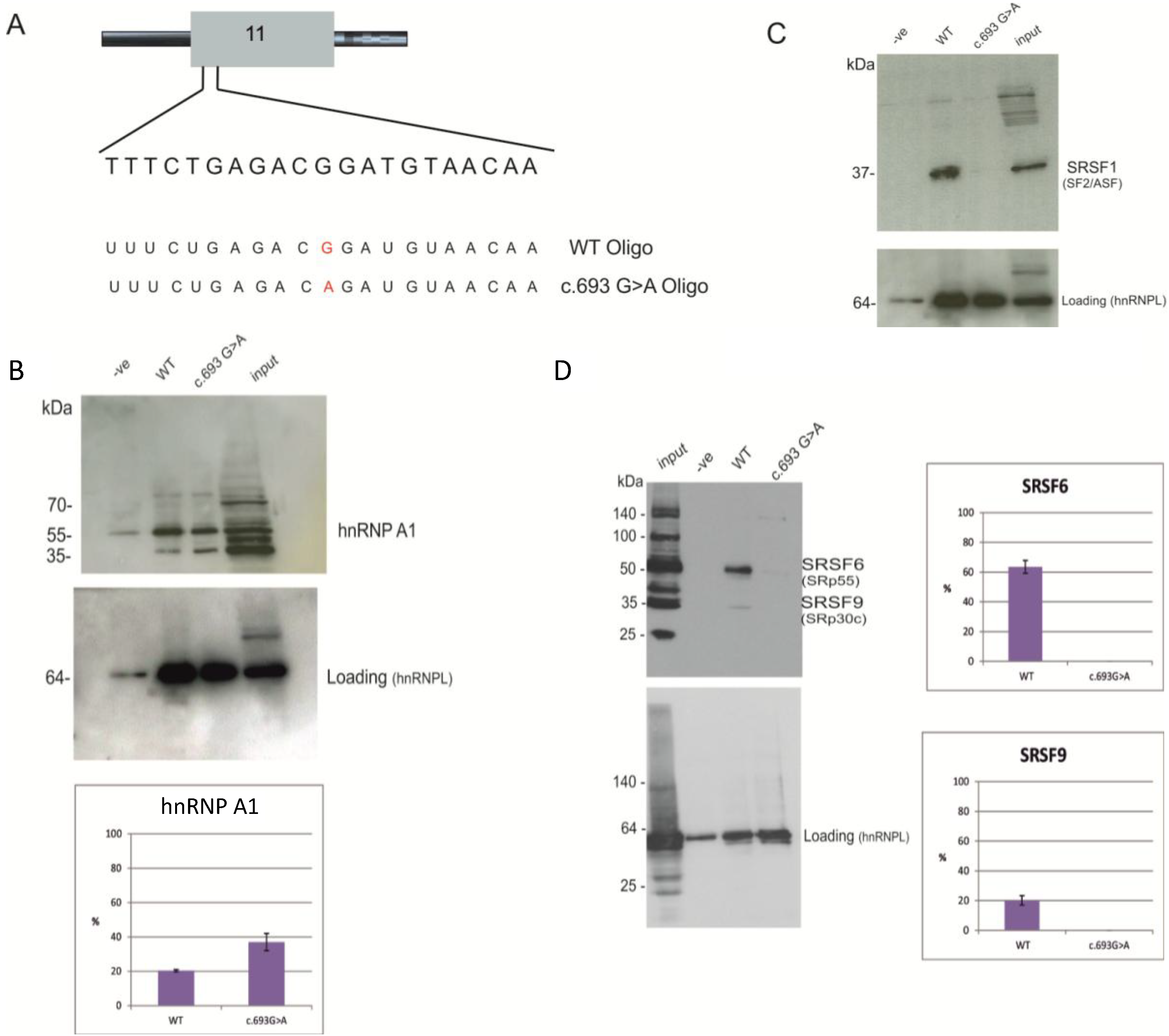 In summary, the pull-down experiments suggest that SRSF1, SRSF6 and SRSF9 are the splicing factors binding the regulatory region identified in exon 11 and that their binding is disrupted in the presence of the variant, c.693G>A. The western blot analysis also demonstrated that hRNPA1 is able to bind both the wild type sequence and the mutant sequence with the c.693G>A variant. Finally, we see that Tra2beta is able to bind a region downstream of c.693.