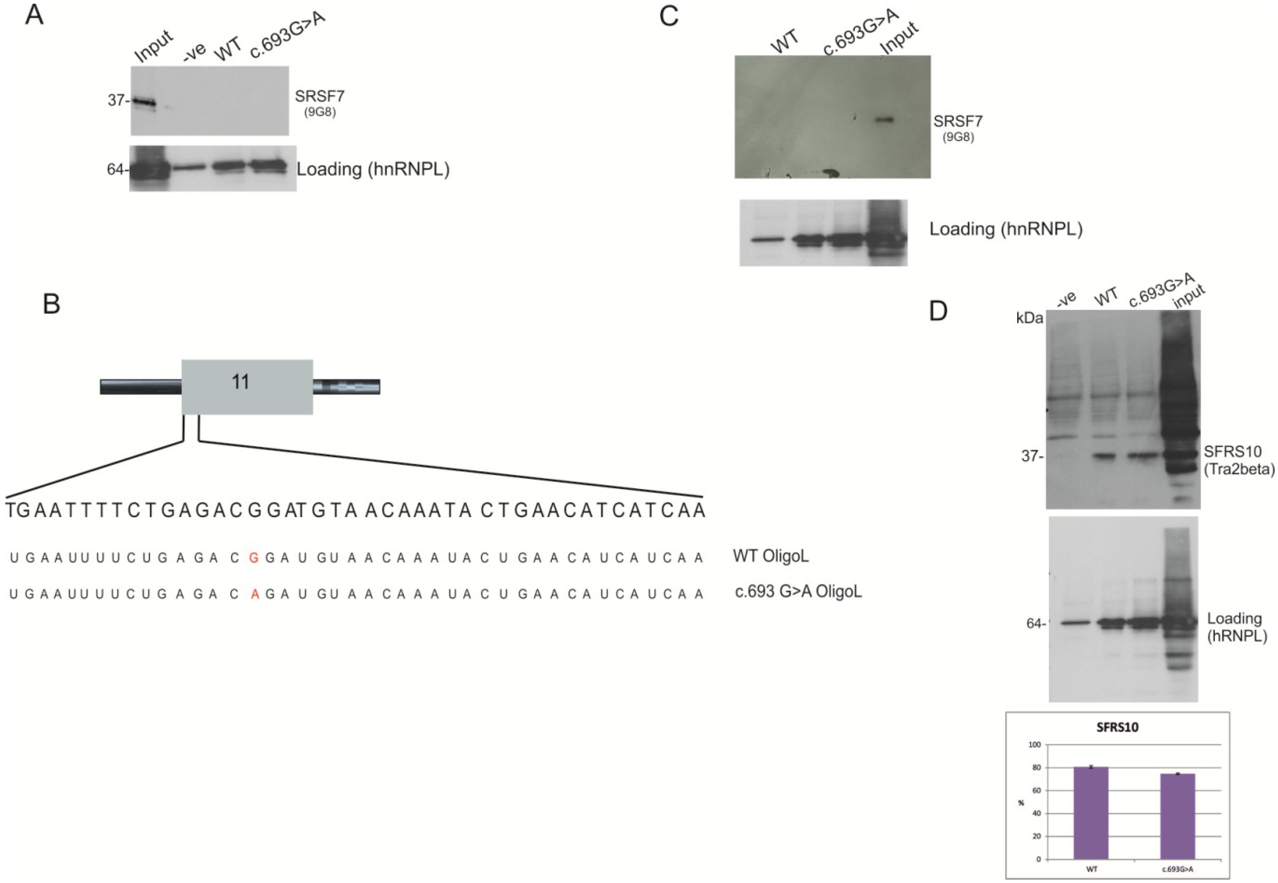 The Human Splicing Finder predicted that in the presence of the variant, c.693G>A, the binding site for SRSF7 is disrupted. However, when using an antibody against SRSF7, we were unable to detect any binding, either in wild-type oligo or the RNA oligo, with variant c.693G>A (Figure 8). This may be because the binding of SRSF7 to RNA could require the binding of accessory SR proteins, in particular Tra2beta [20]. The Human Splicing Finder predicts binding sequences for Tra2beta down-stream of the putative binding sequence for SRSF7 (data not shown). This region is not covered by the 21 synthetic RNA oligonucleotides used for the pull-down analysis. Consequently, a different synthetic RNA oligonucleotide spanning a longer region was analysed in a further pull-down assay (Figure 8B). This long RNA was still unable to bind SRSF7 (Figure 8C). However, using a Tra2beta antibody, we were able to detect the presence of the protein in both the wild-type and the c.693G>A variant (Figure 8D).