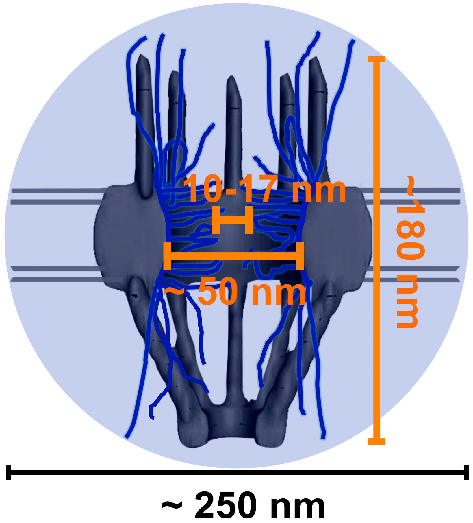 Cartoon image of a nuclear pore complex depicting its length and central axial channel (orange lettering) [42,43,44,45]. Both the nuclear pore complexes (NPC) and the axial channel are below the size of point spread function (PSF) (~250 nm in x and y plane) of conventional light microscopy. The PSF is represented by the light-blue circled area [20,23,45,52,53,54,55].