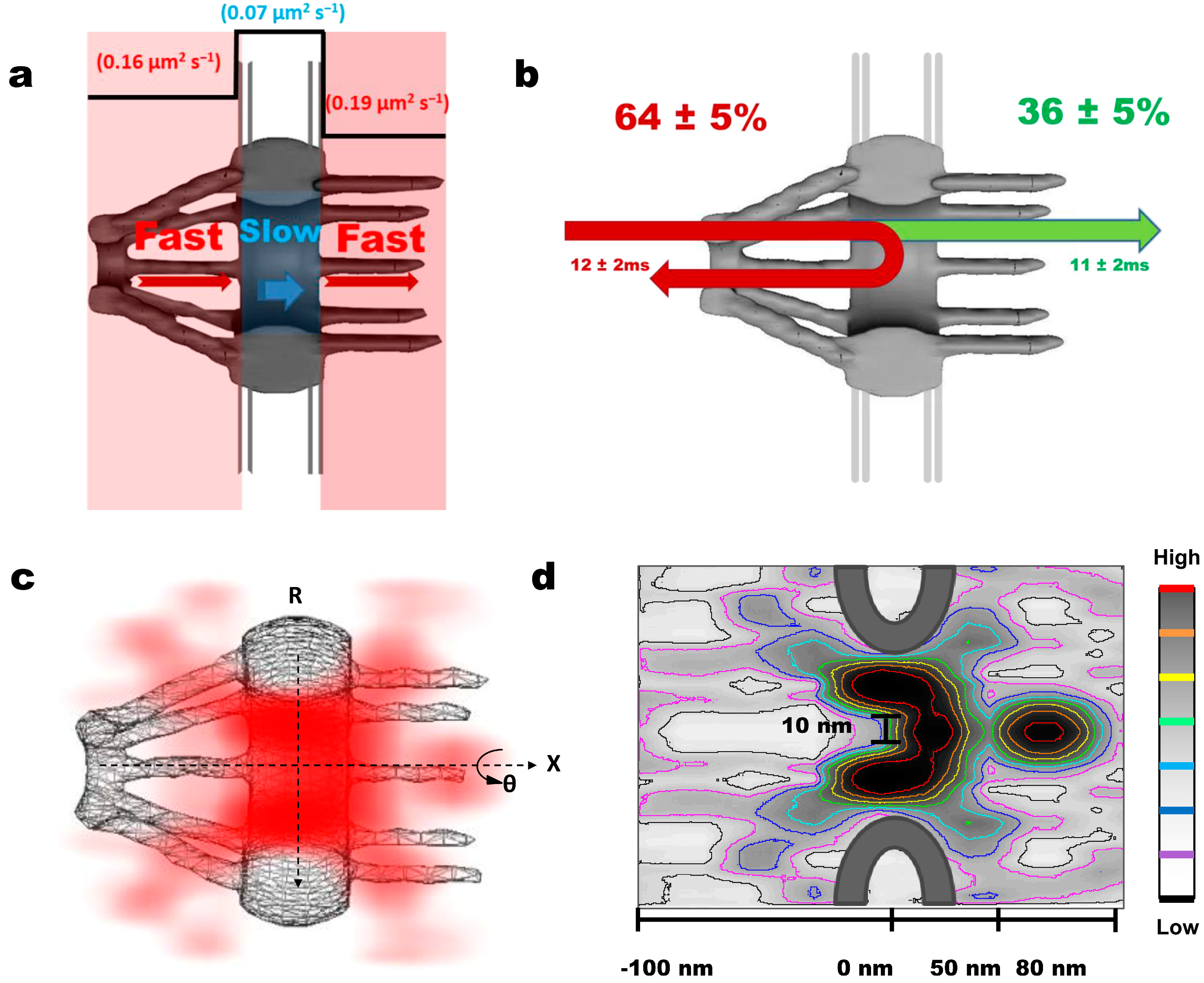 The major new features in the dynamic nuclear export process of messenger ribonucleoprotein particles (mRNPs) revealed by single-point edge-excitation sub-diffraction (SPEED) microscopy. (a) Cartoon representation of the fast-slow-fast diffusion pattern that mRNA takes through the NPC; (b) Diagram shows the abortive and the successful transport events. Green depicts ~36% of recorded single mRNPs that successfully traveled through the NPC and reached the cytoplasm during their ~11 ms transport time. Depicted in red are the abortive events ~64% and the associated transport time of ~12 ms; (c) 3D probability density map reveals the nuclear export route through the NPCs in live cells. mRNP 3D positional data (red) is plotted over a cutaway schematic representation of NPC structure. (Deeper shading represents higher density). mRNPs translocate through the periphery of the NPC while rarely occupying a central axial channel before dissociation occurs on the cytoplasmic side; (d) Contour plot of mRNP export through the NPC highlighting the unoccupied axial channel (from −100 to 20 nm) with a diameter of 10 nm at the narrowest waist and the dissociating region, where mRNA invades the central axial channel at the end of its export pathway (from 50 to 80 nm). Color bar indicates spatial density from low to high.