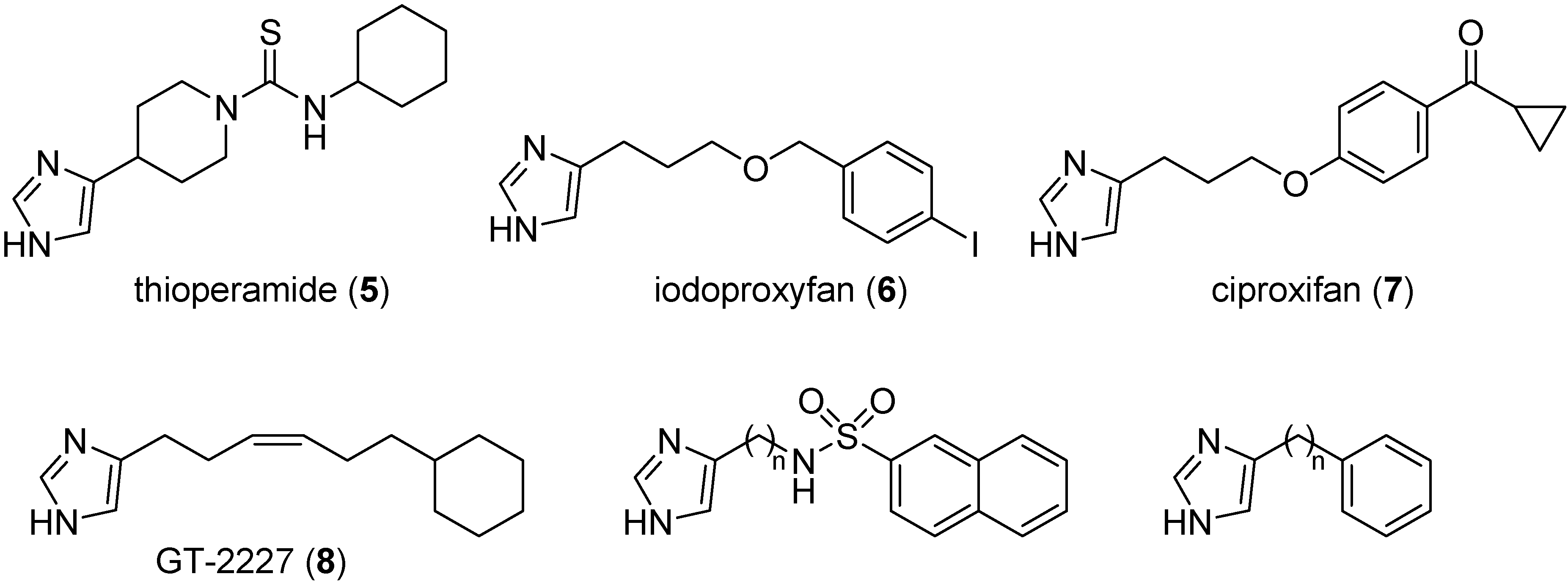 - Vollinga, R.C.; Menge, W.M.; Leurs, R.; Timmerman, H. New analogs of burimamide as potent and selective histamine H3 receptor antagonists: The effect of chain length variation of the alkyl spacer and modifications of the N-thiourea substituent. J. Med. Chem. 1995, 38, 2244–2250. [Google Scholar] [CrossRef]