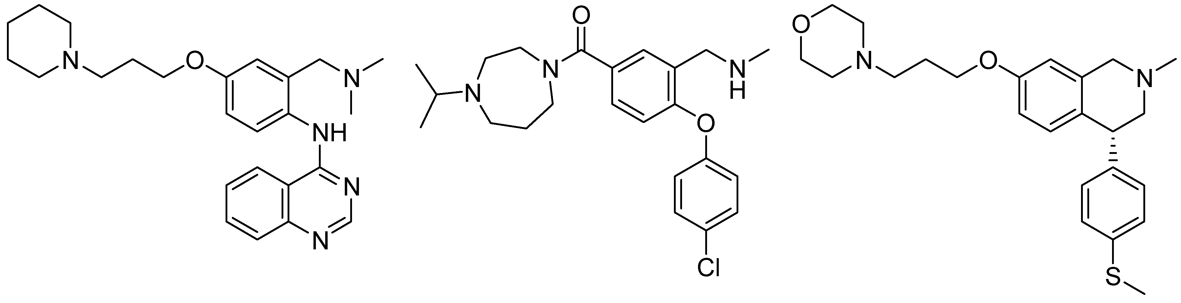 The H3 receptor should be able to interact with these compounds by binding their imidazole ring through E206 on TM5, as supported by mutagenesis experiments on histamine and other imidazole-based ligands [43]. The anilinoethylamide fragment could be docked within a lipophilic cavity identified in H3 receptor models [44,45], mainly delimited by TM2, 6 and 7, and roughly perpendicular to the region where E206 is located (Figure 4, right). The existence of this lipophilic cavity is supported by the high binding affinity shown by H3 receptor antagonists with two basic centers and a lipophilic substituent that could extend over both binding site cavities (Figure 5) [45,46,47].