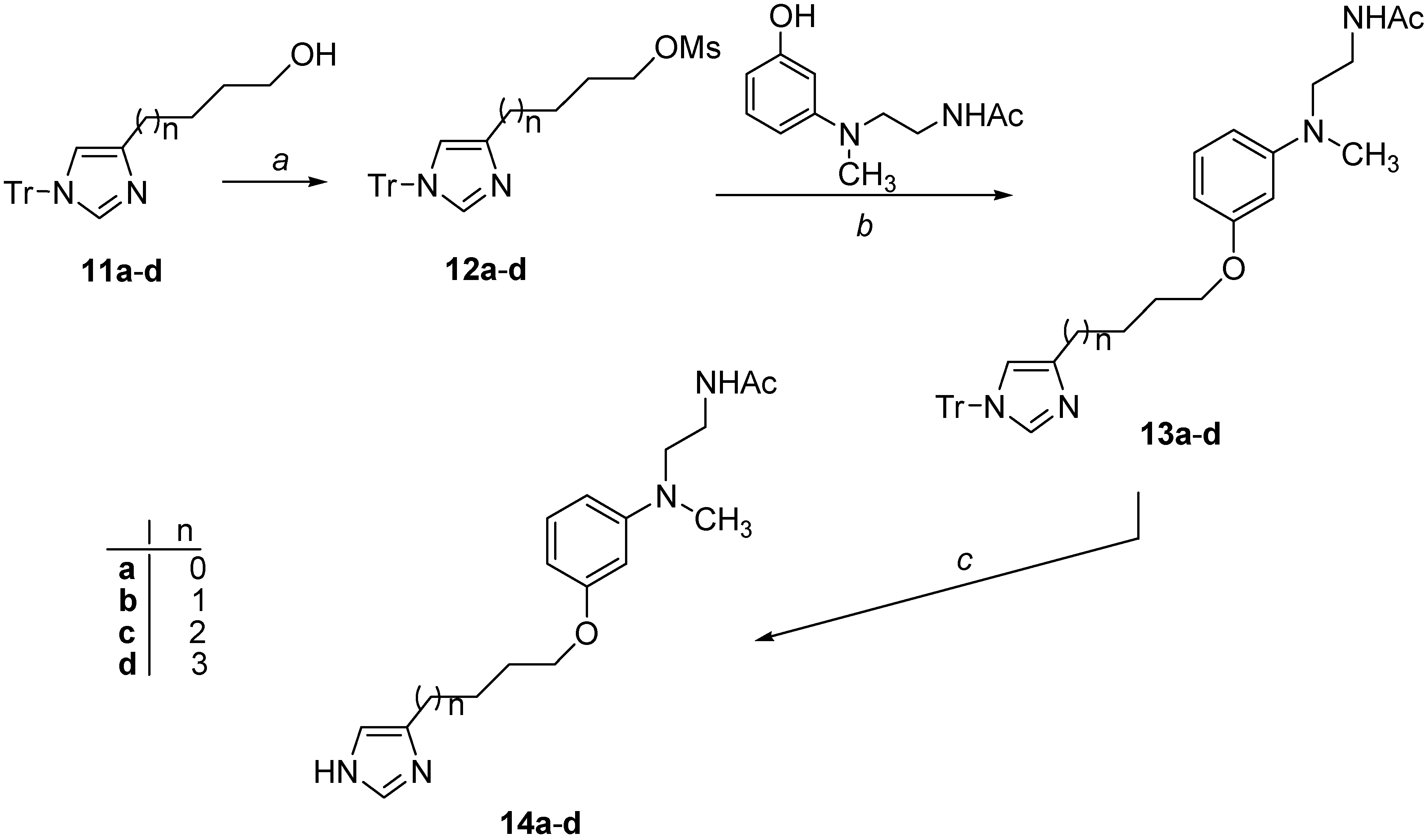 The N-protected compounds 13a–d were obtained by mesylation of the suitable (1-trityl-imidazol-4-yl)alkan-1-ol 11a–d, followed by substitution of the intermediate methansulfonates 12a–d with N-{2-[(3-hydroxyphenyl)methylamino]ethyl}acetamide [31] in the presence of NaH. Deprotection of the imidazole ring under acidic conditions finally yielded the target compounds 14a–d (Scheme 2).