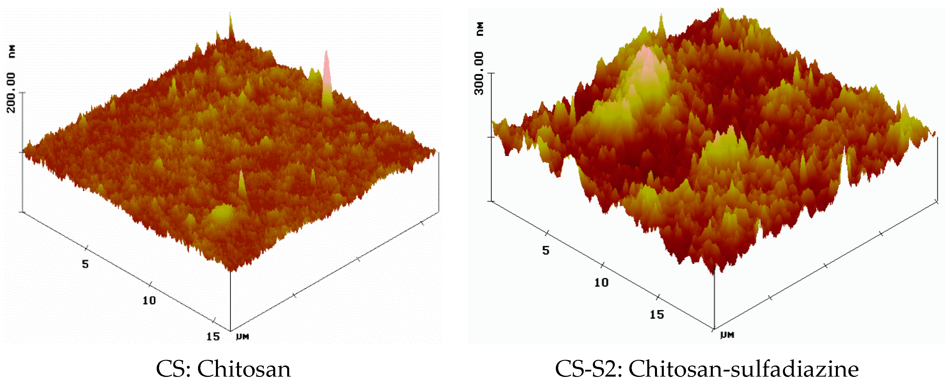 AFM image of chitosan (CS) and of chitosan-sulfadiazine (CS-S2) films.