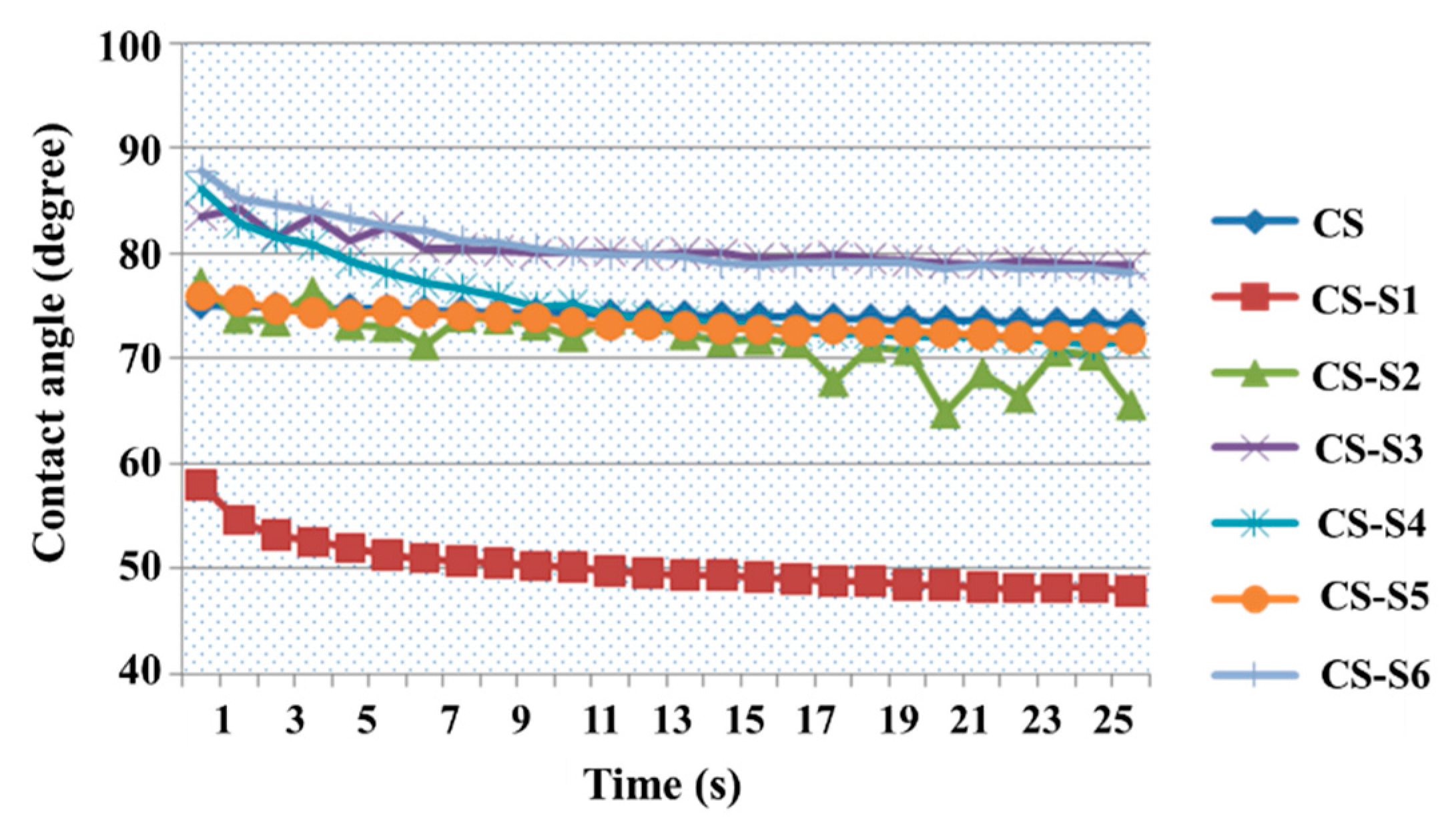 The results obtained for chitosan-derivative films compared with chitosan are presented in Figure 3. The water contact angle value for chitosan film at moment zero is 75.06°, while the values for chitosan derivatives are between 57.98° (CS-S1) and 87.84° (CS-S6), depending on the structure of the sulfonamide used to functionalize the chitosan. Even if, for some chitosan derivatives (CS-S3, CS-S6), the value of the water contact angle recorded over 30 s was easily increased compared to chitosan, it can be appreciated that the chitosan derivatives remain hydrophilic because the value of the water contact angle is less than 90°. The most hydrophilic compound is chitosan-sulfamethoxydiazine (CS-S1) with a contact angle value of 57.98° at time 0, and 47.81° at the end of the experiment.