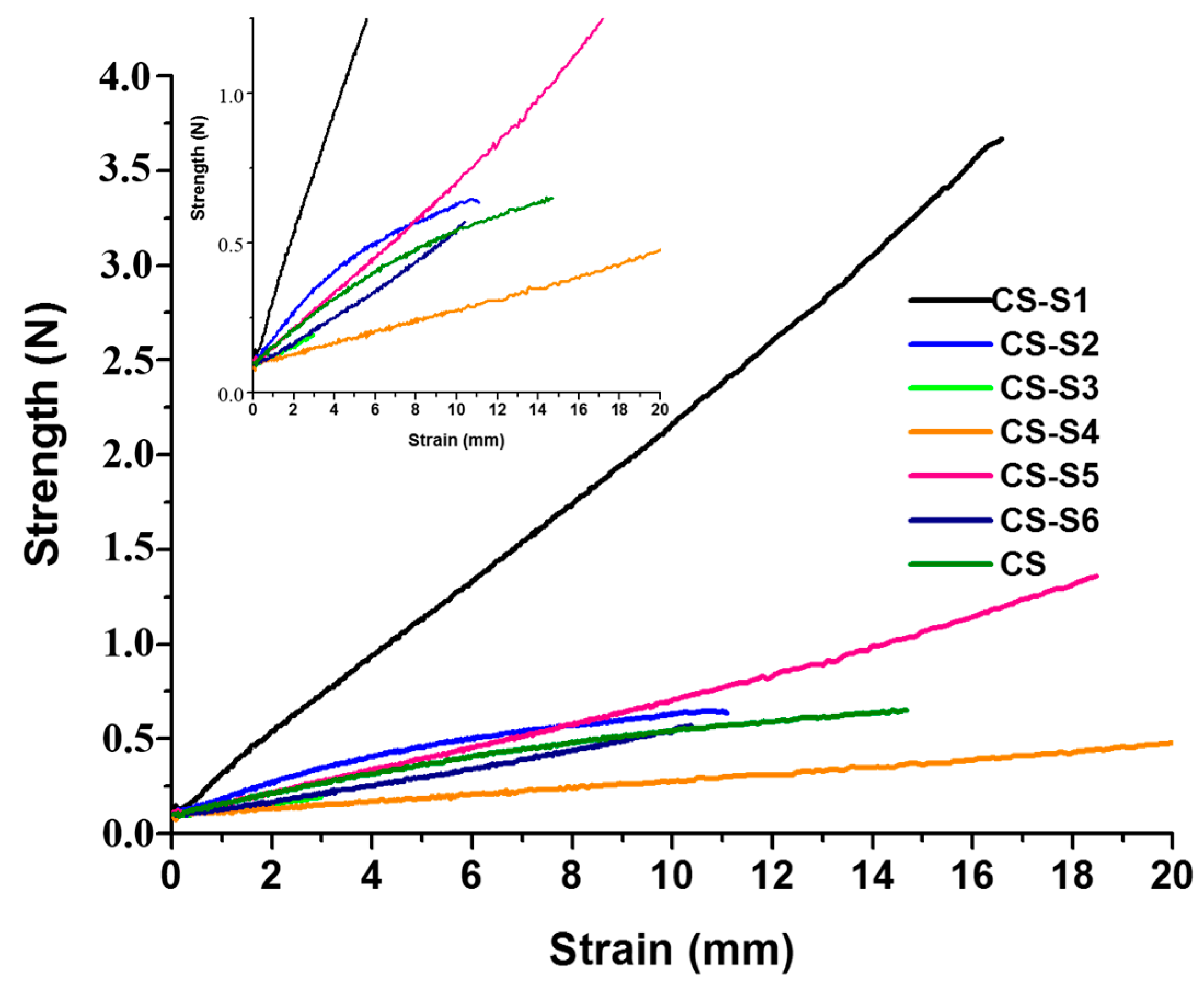 The strain (mm) of chitosan (CS) and chitosan-derivative films.