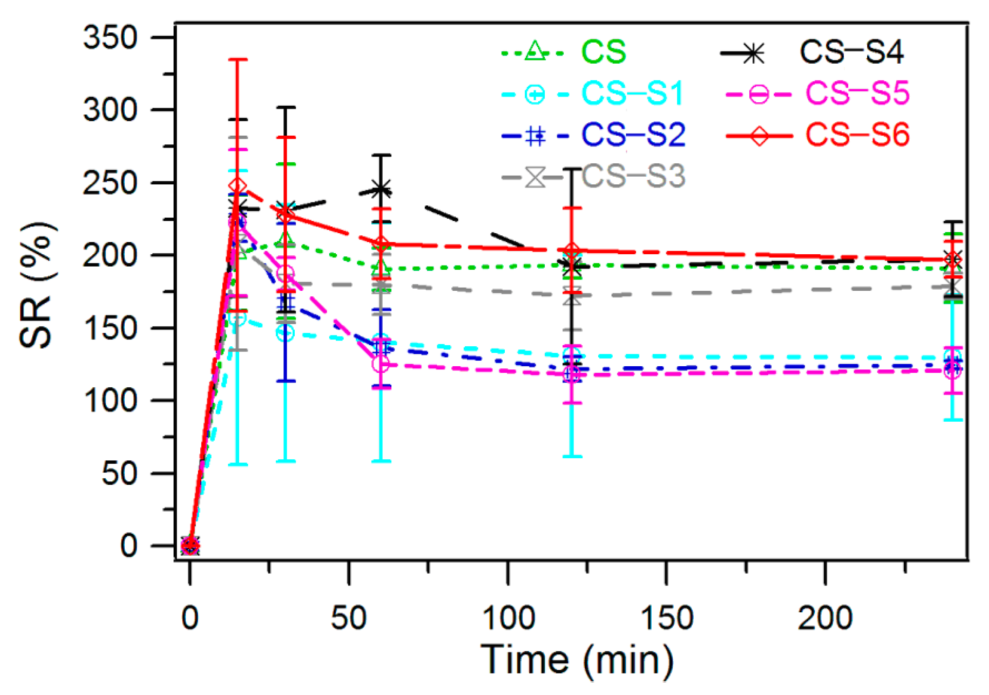 For the chitosan film the thermodynamic equilibrium was achieved after 60 min when the recorded swelling ratio was 190% (Figure 6). Chitosan-derivative films showed a similar swelling ratio except for chitosan-sulfadiazine (CS-S2), chitosan-sulfamerazine (CS-S5) and chitosan-sulfamethoxydiazine (CS-S1). For these chitosan derivatives the thermodynamic equilibrium was achieved after 120 min (CS-S1, CS-S2) and 60 min (CS-S5), respectively, with a corresponding swelling ratio of 122%, 125% and 130%. The highest swelling ratio was recorded for chitosan-sulfisoxazol (CS-S6), for which the swelling ratio was 197% at thermodynamic equilibrium which was reached after 240 min.