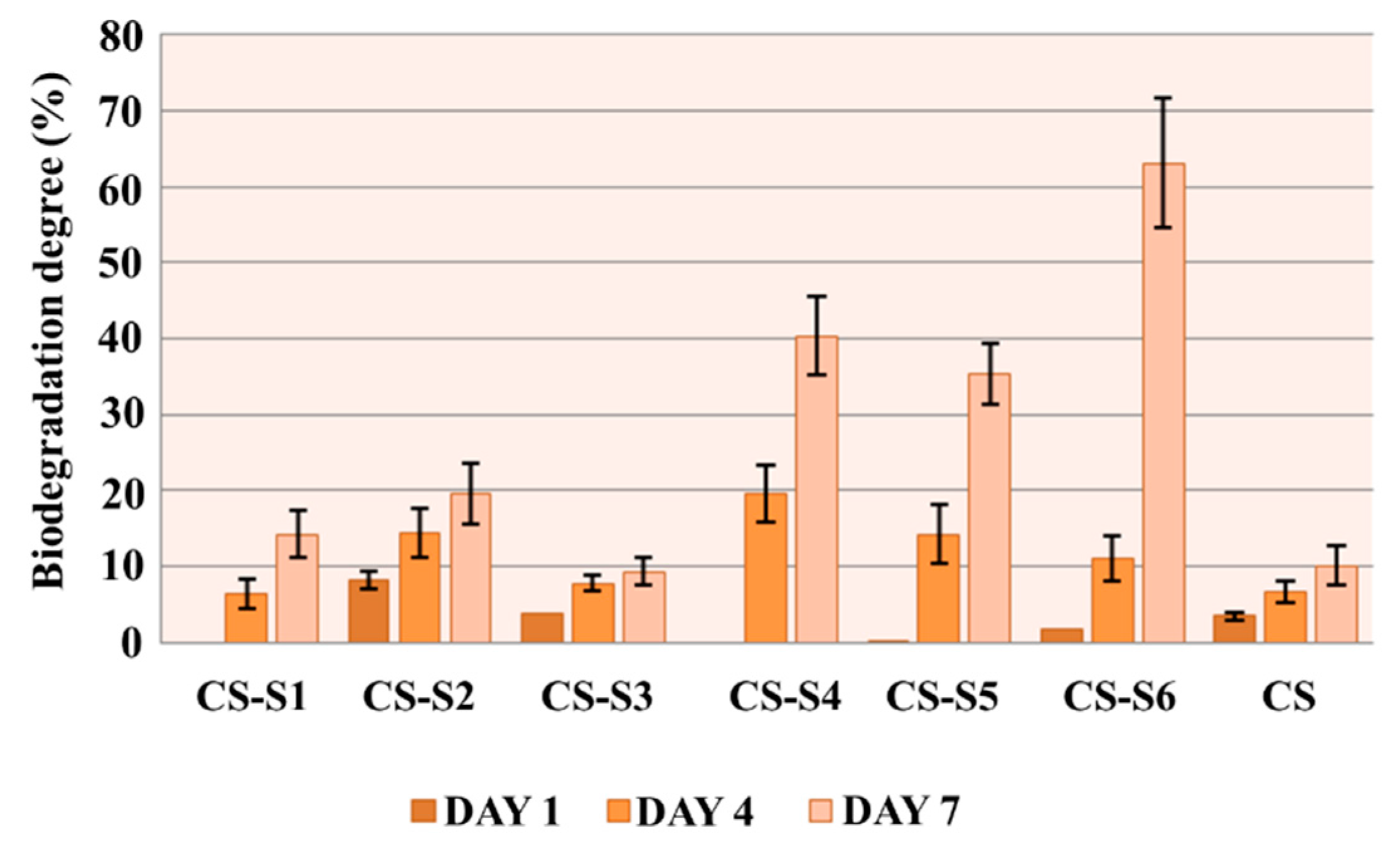 The results of the in vitro biodegradation of chitosan-derivative films are presented in Figure 7. With the exception of the chitosan-sulfamethoxydiazine (CS-S1) and chitosan-sulfadimethoxine (CS-S4) films, for which no biodegradation was recorded on the first day of the experiment, the rest of the compounds showed biodegradation on the first day and it increased during the experiment.