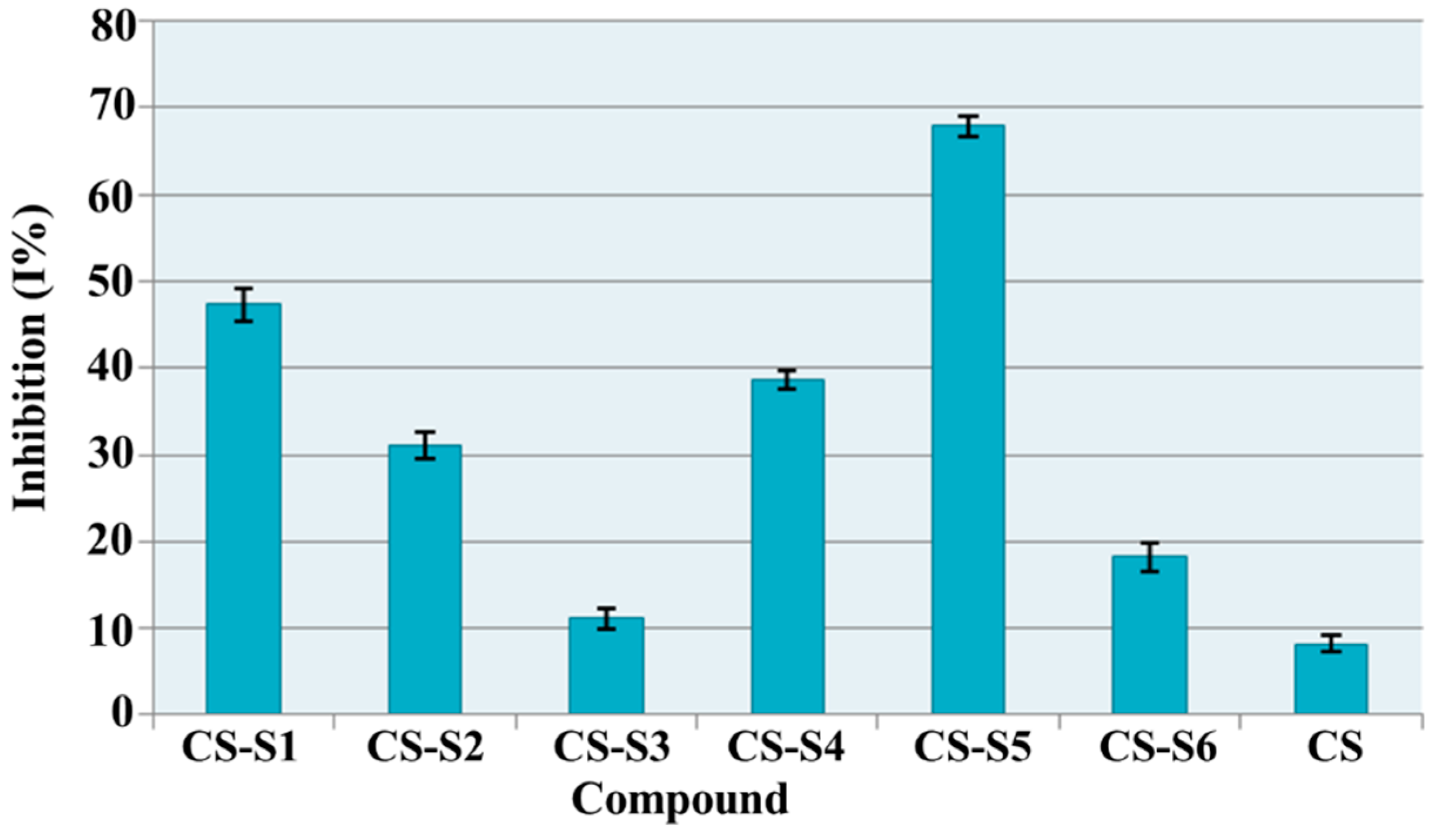 According to the obtained results (Figure 10), chitosan derivatives showed a good scavenging ability, which ranged between 11.16% (CS-S3) and 67.89% (CS-S5), while for chitosan (CS) this value was 8.14%. The most active compounds were chitosan-sulfamethoxydiazine (CS-S1, I% = 47.31%) and chitosan-sulfamerazine (CS-S5, I% = 67.89%). These compounds are 5.8 times and 8.3 times respectively more active than chitosan.
