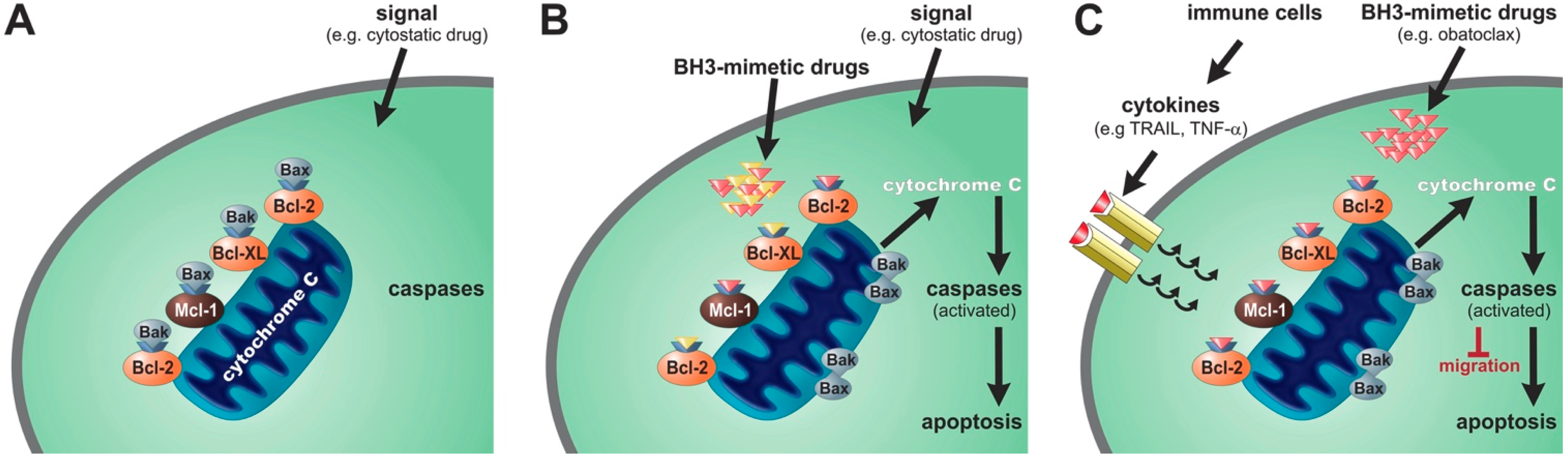 Effects of BH3-mimetic drugs. Overexpression of proteins of the Bcl-family in tumor cells cause capture of Bak and Bax in BH3-binding sites, which prevents initiation of the apoptosis cascade via intrinsic or extrinsic stimuli (A); BH3-mimetic drugs lead to the release of Bak and Bax, which oligomerize and insert as a complex in the outer mitochondrial membrane. This membrane permeabilisation is followed by cytochrome c release and other pro-apoptotic factors into the cytoplasm, initiating apoptosis and leading to cell death (B); BH3-mimetic drugs can enhance dead signals from immune cells (TRAIL, TNF-α) and can influence migration of tumor cells (C).