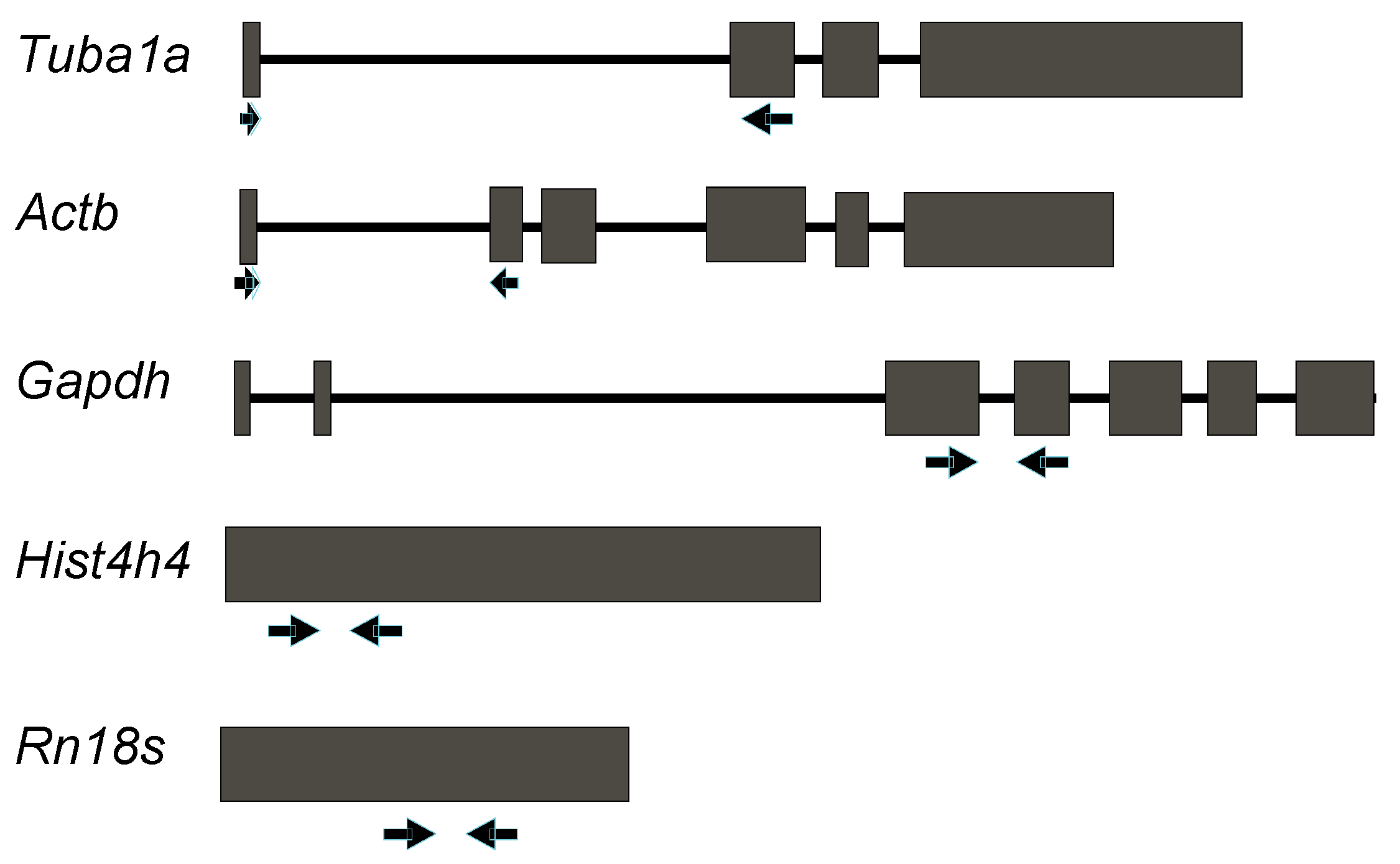 Primer pairs for qRT-PCR-based expression analysis of the genes chosen for the present study were designed using the Geneious software [14] (Table 1). Primer pairs for Tuba1a, Actb and Gapdh were spanning an intron (Figure 1) to avoid artefacts produced by leftovers of genomic DNA or precursor mRNA during quantitative PCR amplification of cDNA after reverse transcription from RNA. The primer pairs for Hist4h4 and Rn18S were located in one exon due to their gene structure. A nucleotide BLAST (Basic Local Alignment Search Tool) search of the mouse RefSeq RNA database using the sequence of the designed primers as query revealed that the selected primer pairs specifically bind to their respective target transcripts and amplify only a single amplicon of the expected length, as supported by NCBI E-values lower than 0.05 (Table 2). In addition, the primer pairs were designed in order to amplify any known transcript variants or isoforms of their respective target. Interestingly, the analysis for Actb revealed that the mRNA sequence shares 91% homology with Lrrc58 (leucine rich repeat containing 58). Thus, primer pairs were designed such that only the specific amplicon of Actb was obtained. Further, using the tool jPCR [15] and the Sigma Aldrich Oligo Evaluator online tool, it was confirmed that the primer pairs did not form primer dimers, had a similar annealing temperature, amplified amplicons of comparable length (between 151 and 312 base pairs) and did not form secondary structures for all the genes analysed in this study (Table 2).