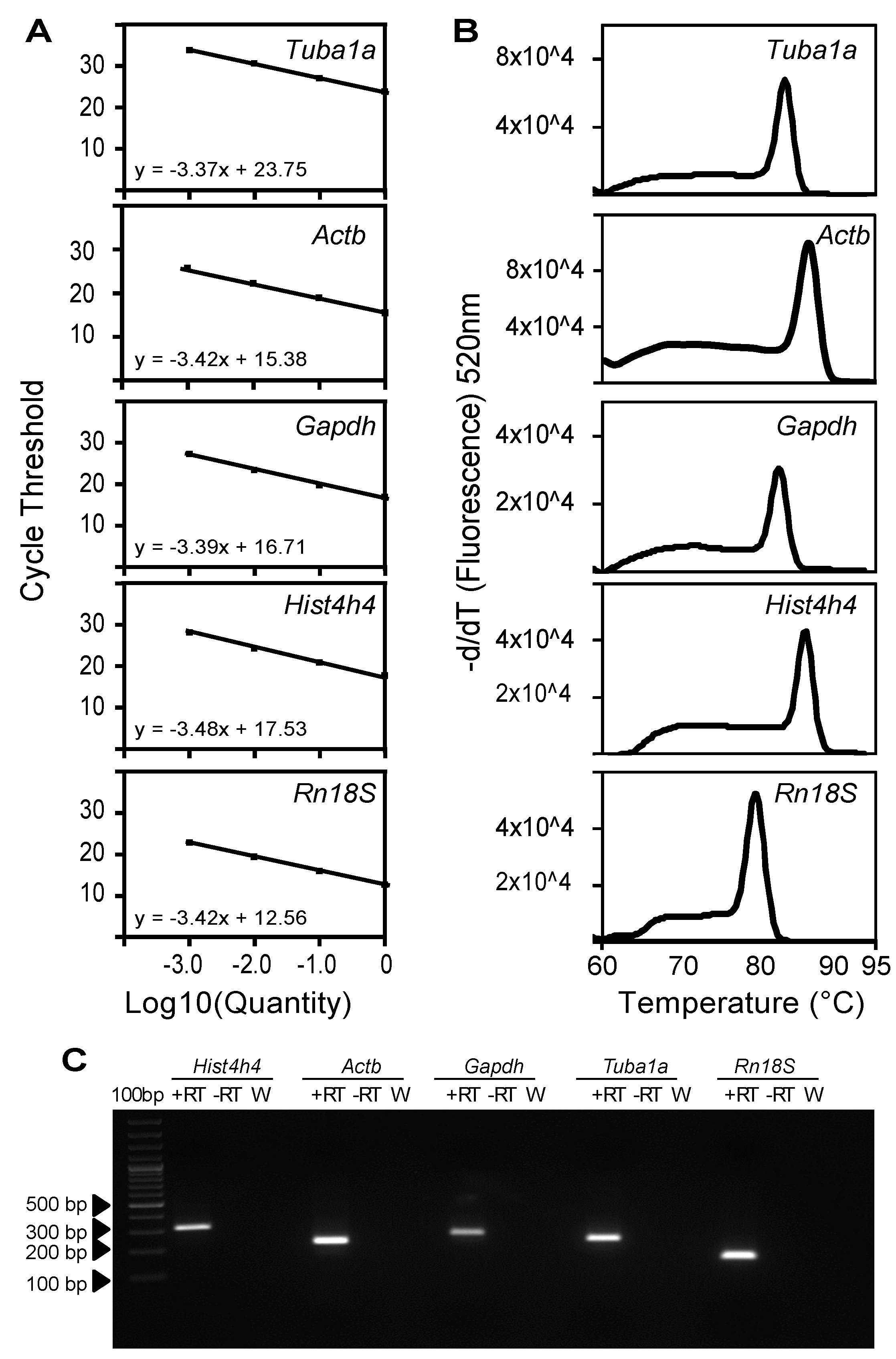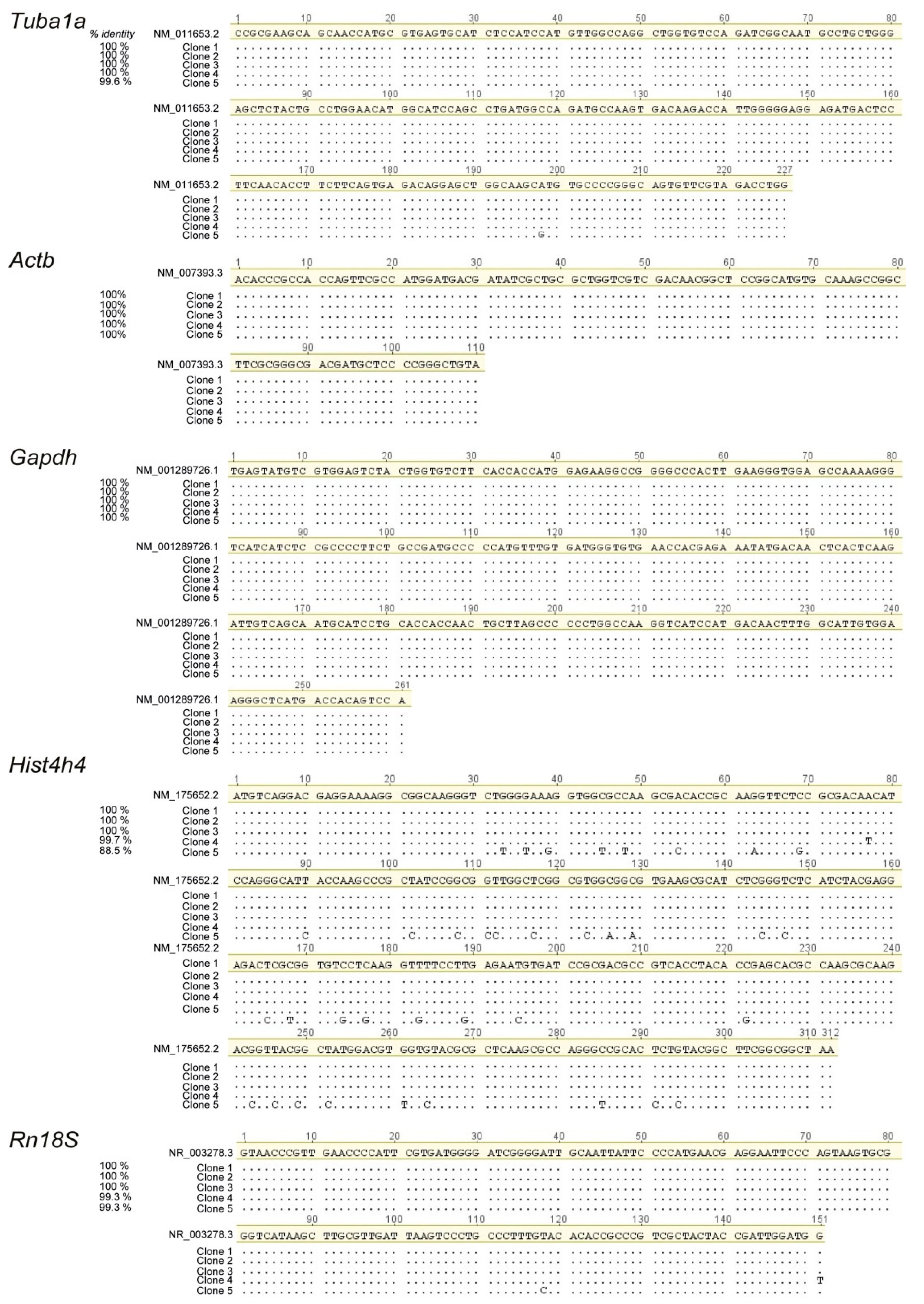 Optimal primer pair design achieves doubling of the specific PCR product after each cycle of the PCR reaction during the exponential phase of amplification. In this ideal situation, the amplification efficiency of the primer pair would be 100% and the qRT-PCR results can be analysed using the 2(−∆∆CT) method [16]. We decided to determine the amplification efficiency of the primer pairs that we designed for each one of the genes analysed in this study (Figure 2). Therefore we have performed qPCRs using the different primer pairs and, as a template, tenfold serial dilutions of a cDNA mixture of known concentration. The results of these qPCRs were used to elaborate a standard curve for each one of the primer pairs by plotting the template quantity (log10; x-axis) against the threshold cycle (CT; y-axis) (Figure 2A). The resulting standard curves can be described by the function y = mx + c, where m is the slope of the line, c is the y-axis intercept and x is the independent variable of the function y = f(x) The amplification efficiency (E) of each primer pair was calculated using the slope of the standard curve and the formula, E = (10(−1/Slope) − 1) × 100% [17] (Table 2). Four of the five primer pairs analysed in this study had amplification efficiencies above 97%. Only the primer pair for Rn18S showed an amplification efficiency of 95.9%. However, the amplification efficiency of all the primer pairs analysed here was within the acceptable range of 100% ± 10% [18]. In addition, the dissociation curve analysis of the different qRT-PCR products showed a single peak for each one of the genes (Figure 2B), confirming the absence of non-specific PCR products, primer dimers or secondary structures [19]. Further, agarose gel electrophoresis after qRT-PCR demonstrated a single band of the expected size only in the sample containing the template, while no product was obtained in the negative controls without reverse transcriptase (−RT) or with water (Figure 2C), confirming again the specificity of the primer pairs and the absence of genomic DNA contamination. Lastly, sequencing of the PCR products obtained from each of the reactions confirmed the identity of the amplicons and the specificity of the analysis (Figure 3). For Tuba1a, Actb, Gapdh and Rn18S, all the five clones showed specificity to the intended product. However, for Hist4h4, Clone 5 showed only 88% homology to the target. This can be explained by the fact that the histone cluster genes are highly conserved and all of them give rise to an identical Histone 4 (H4) protein. Although the designed primers were targeting Hist4h4, the primers also recognized Hist2h4, despite considerable mismatch, resulting in a product of identical size. Clone 5 was highly similar to Hist2h4, a Histone 4 variant that is encoded by Histone Cluster 2, which shows only 86% homology to HistH4h.