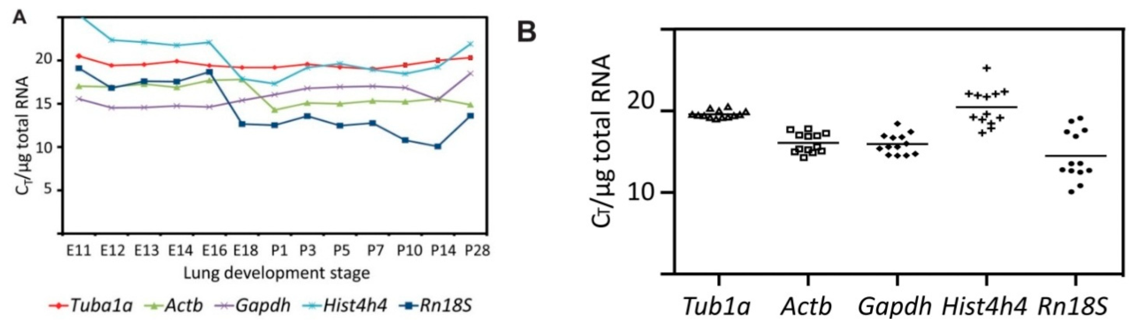 Furthermore, several reports based on different statistical algorithms suggest the use of at least two different endogenous controls for the normalization of expression analysis to increase the accuracy and reliability of the data [31]. In our study, Tuba1a and Actb were found to be the most suitable, while Actb and Gapdh were the second most suitable pair of reference genes for normalization during mouse lung development. However, due to a large number of reported pseudogenes [41], Actb and Gapdh may be used with some scepticism to support and complement the results obtained after Tuba1a normalization. Hist4h4 and Rn18S showed the maximum variability in their expression during the different phases of mouse lung development, with a remarkable increase in their expression at later stages, supporting that they are not appropriate as internal controls for expression analysis during lung development. Our results indicate that it is essential to include validation of reference genes as an integral part of the experiment design. Inappropriate reference genes may have a profound influence on the results which includes divergent outcomes leading to inaccurate data interpretation.