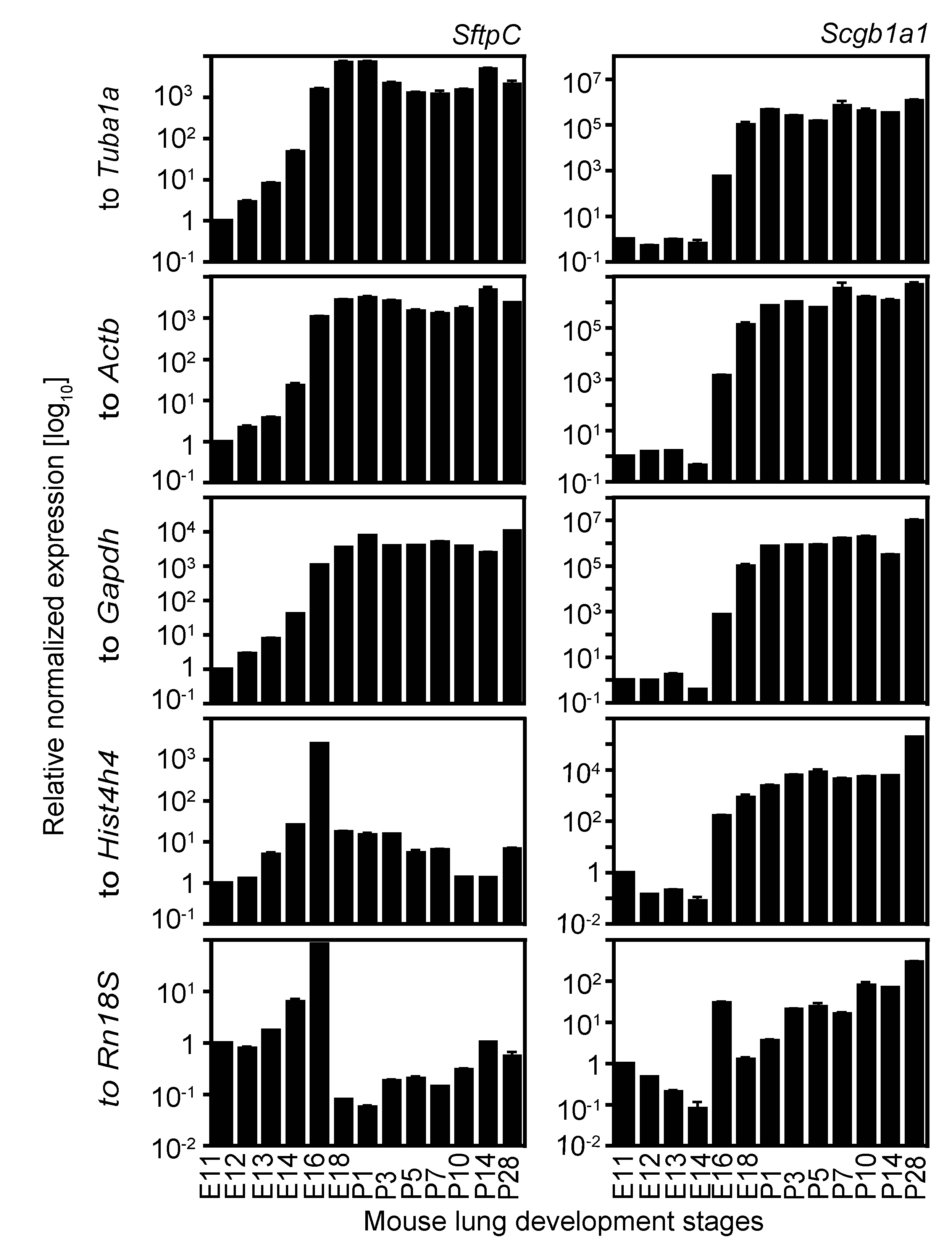 Our work is the first exhaustive study to validate internal controls for expression analysis through lung development. The relevance of our work was demonstrated by changing the results of qRT-PCR expression analysis for two epithelial markers during lung development when inappropriate reference genes were used for normalization. Proper verification and subsequent selection of suitable endogenous controls for a specific experimental setup will prevent inadequate quantification. The stability of expression of an internal control is required for accurate and reliable normalization in expression analysis experiments.