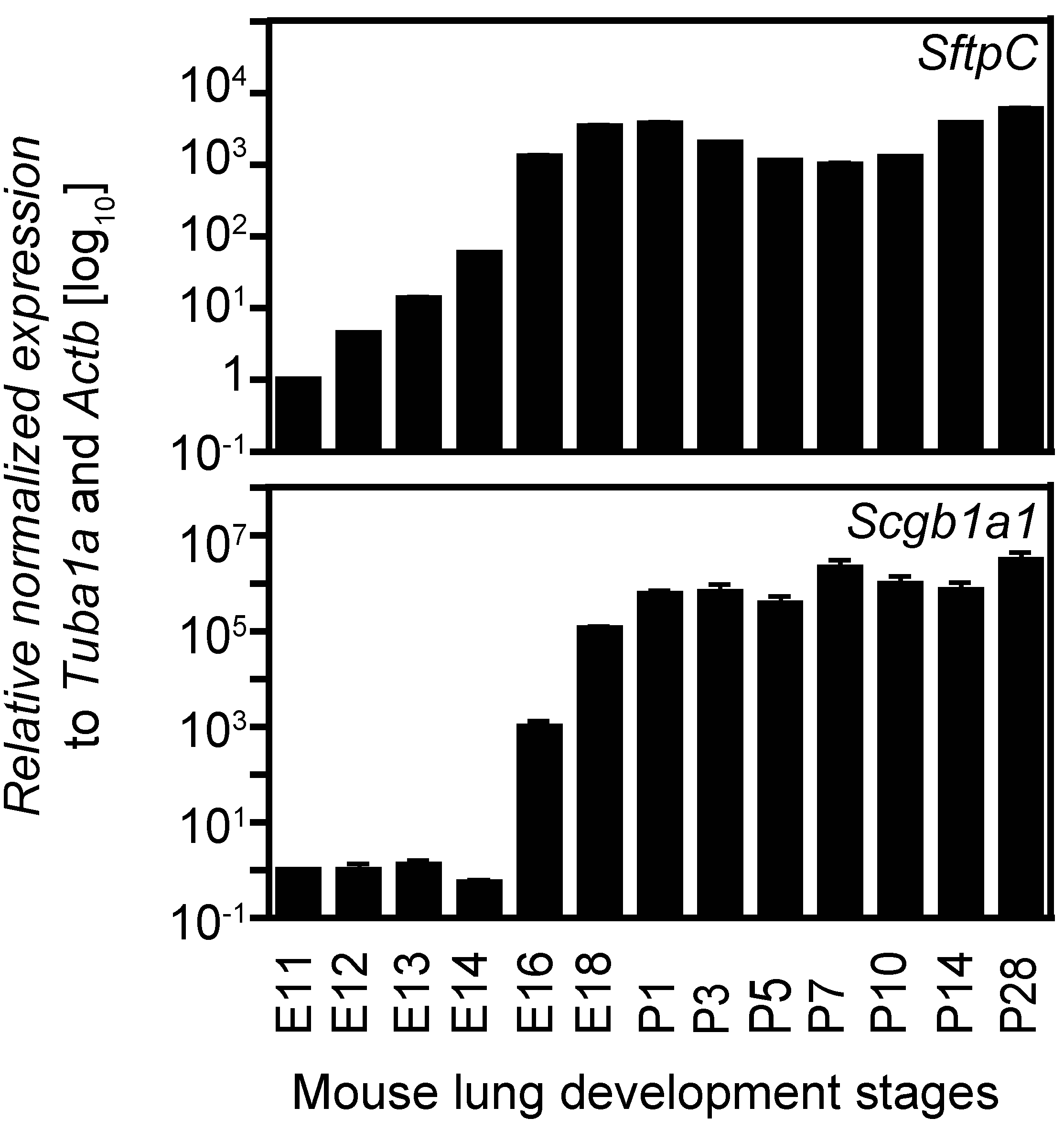 Expression analysis of two cell lineage markers during mouse lung development using a combination of two reference genes for normalization. Expression of surfactant protein C (SftpC) and Clara cell-specific 10 kDA protein (Scgb1a1) was analysed during lung development by qRT-PCR. Expression analysis in all stages of lung development was normalized to both Tuba1a and Actb. Days post coitum, E; postnatal, P. Data are represented as mean ± SD; n = 3.