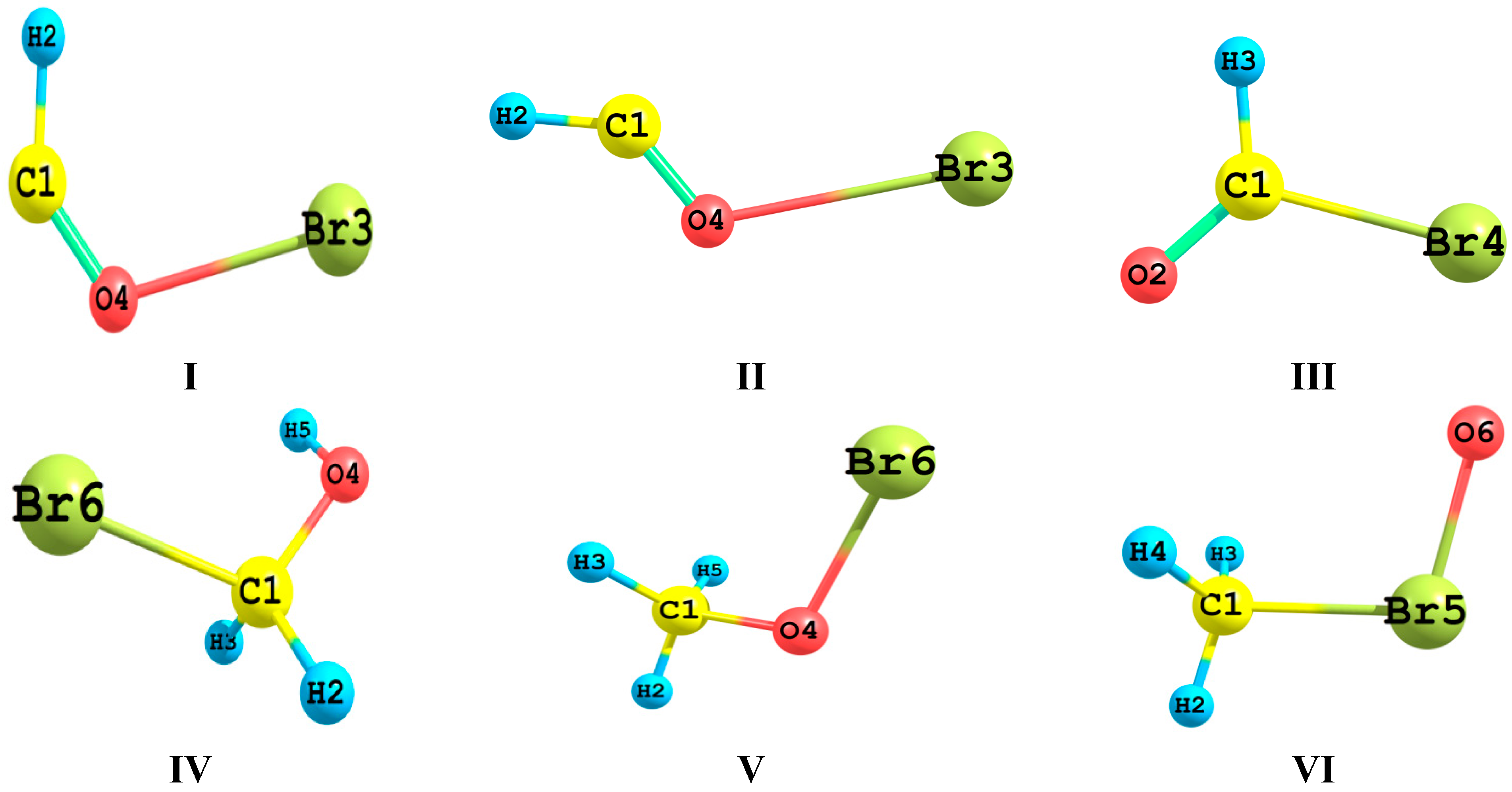 The optimized geometric structure and atom labeling of cis-BrOCH (I); trans-BrOCH (II); BrCHO (III); BrCH2OH (IV); CH3OBr (V); and CH3BrO (VI).