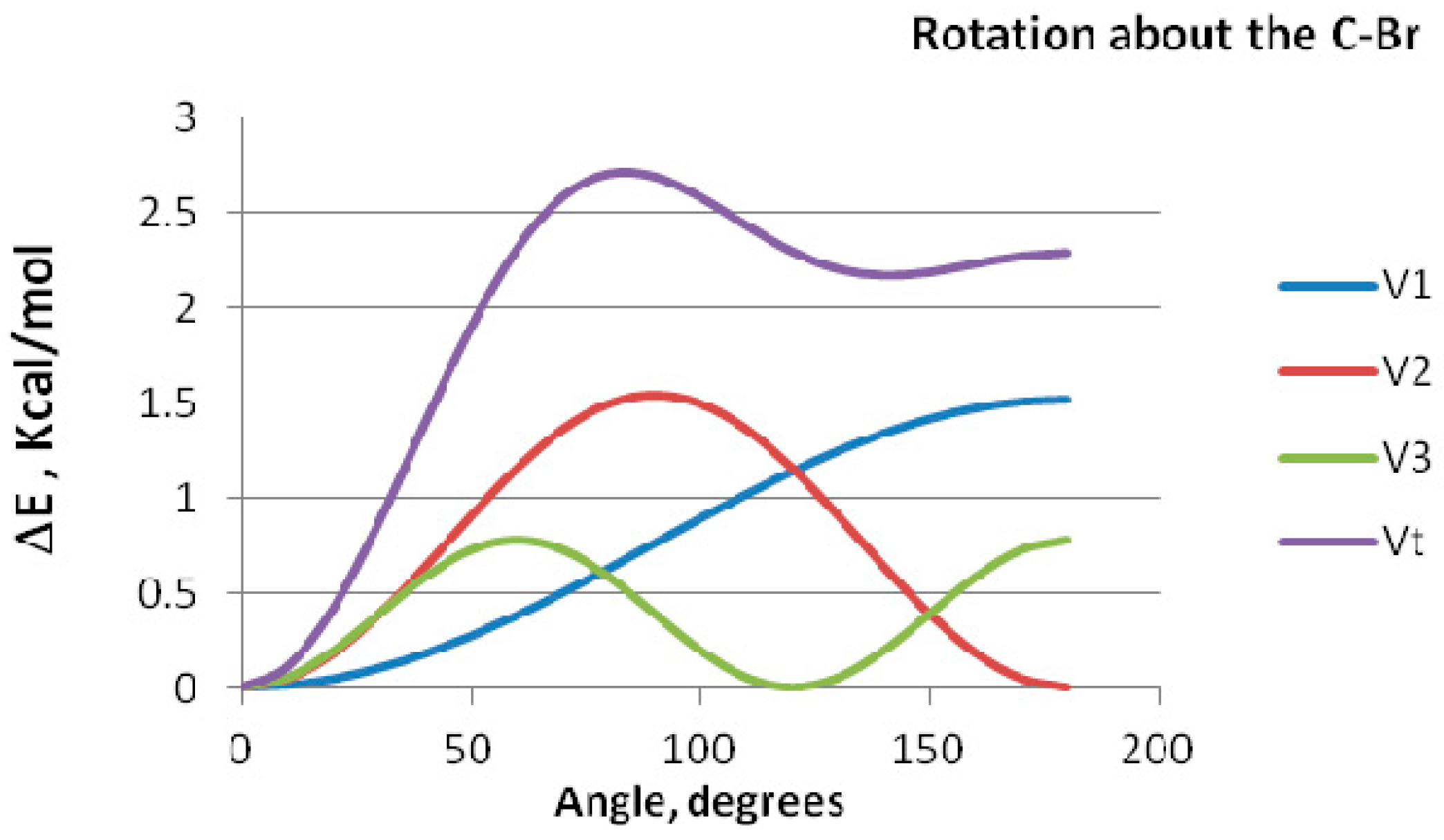 The computed rotation barriers are depicted in Table 2. The large difference in magnitude between the energy barriers for BrCH2OH and that of the CH3OBr and CH3BrO indicate clearly that rotation about C–Br and O–Br bonds is of a completely different nature than that about the C–O bond. Delocalization interaction underlies the large rotation barrier for rotation about the C–O bond in BrCH2OH. The origin of this rotational barrier can be identified by Fourier analysis of internal rotation function as detailed by Pople et al. [22,23]. In this analysis, the potential energy is partitioned into components, namely bond dipoles, conjugative and electrostatic repulsion contributions The Fourier transform equation can be represented as V(φ) = V1(φ) (1 − cos φ) + V2(φ) (1 − cos2φ) + V3(φ) (1 − cos3φ), where φ is the rotation angle, the V1 represents the interaction of bond dipoles, V2 represents the conjugative interaction, and V3 is an electrostatic bond–bond repulsion term. Fourier decomposition of the potential function for CH3BrO has been performed; results are displayed in Figure 3.