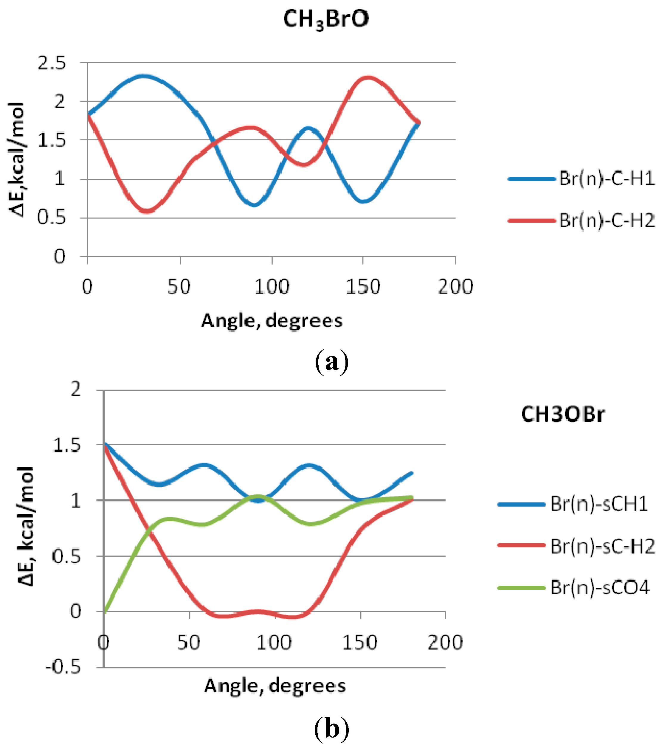 The C–F bond has been shown [27] to impact the conformational preferences of organic compounds suggesting its potential utility as a molecular design tool. This impact of the conformational preferences is due to stereoelectronic effects, specifically the anomeric [28] and gaughe effects [29]. These effects may be defined as the hyperconjugative interaction of the fluorine lone pair with the σ framework. There is no corresponding studies on the C–Br bonds. It is thus interesting to examine, quantitatively, (1) whether such effects exists in the case of the C–Br and O–Br bonds; and (2) the extent to which it impacts the conformational preference of the studied compounds. To that end the interactions of the bromine lone pair (nBr) with the σ* C–H MO have been computed as a function of torsion angle of rotation about the C–Br and O–Br bonds. Results are displayed in Figure 4a,b.