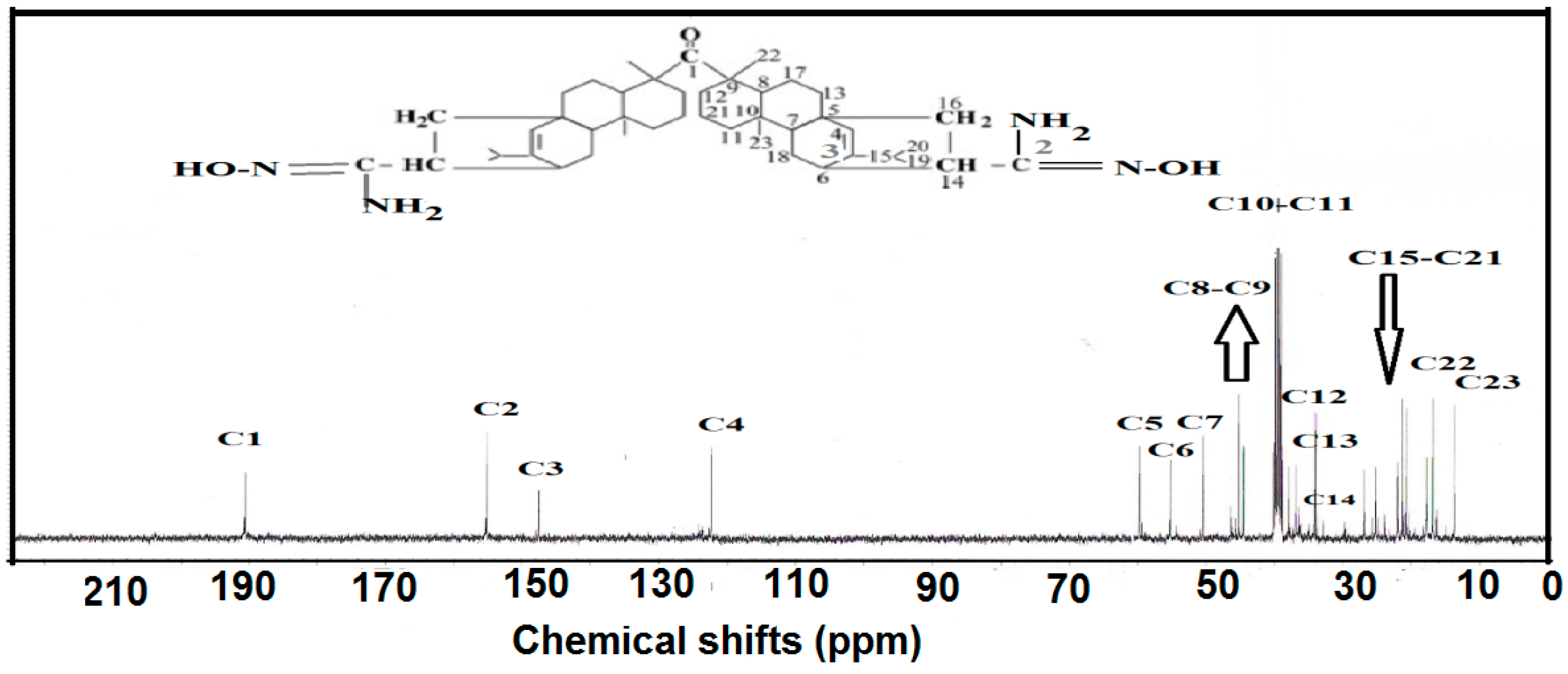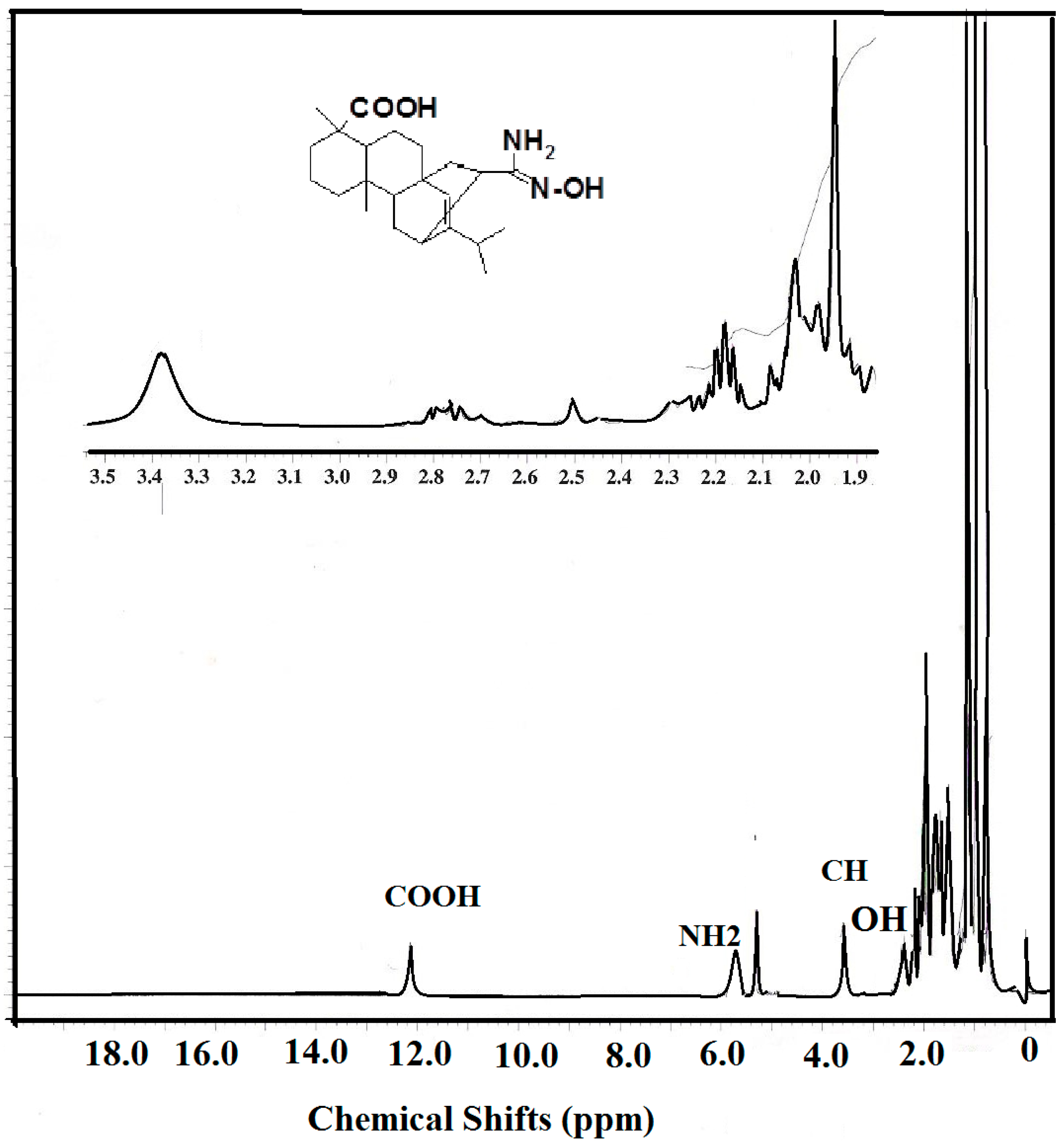 The cycloaddition reaction between RA and AN was completed by isomerization of abietic acid (the major constituent of RA) into leveopimaric acid at a high reaction temperature (185–190 °C) and with a prolonged reaction duration (10 h) developed with high yields (ca. 95%) [28]. The isomerization occurred and developed together with the cycloaddition reaction. The RK-AN was produced by dehydrodecarboxylation R-AN in the presence of p-toluene sulfonic acid (PTSA as catalyst at temperature of 240 °C as illustrated in the Experimental Section and represented in the Scheme 2. The cyanide functional groups of R-AN and RK-AN were reacted with hydroxylamine in an alkaline medium to yield amidoxime groups. The mole ratio of hydroxylamine was in excess to R-AN and RK-AN, the reaction was done for 2 h at 70 °C. A mixture of methanol-water ratio 5:1 was used as reaction medium. Upon amidoximation, the nitrogen content of R-AN and RK-AN changed from 3.93% and 4.33% to 7.31% and 7.91%, respectively. The data of the experimental nitrogen contents of R-AN and RK-AN and their amidoxime derivatives agree with the theoretical calculation which indicated the purity of the prepared rosin amidoxime derivatives and supported the rosin functionalization by post reaction. The FTIR spectra of R-AN was selected as representative for formation of Diels Alder adduct between rosin and AN represented in Figure 1. Moreover, 1H and 13C NMR spectra of RK-AN amidoximes are selected and represented in Figure 2 and Figure 3. FT-IR spectra of R-AN and RK-AN (not represented for brevity; Figure 1), show the characteristic absorption band at 2245 cm−1 due to CN stretching modes in addition of absorption bands of rosin which included C–H stretching at 2936–2870 cm−1, C=O stretching at 1694 cm−1 and C=C stretching in hydrophenanetherene moiety at 1462 cm−1. After amidoxime group preparation (Figure 1B), the CN band at 2245 cm−1 disappeared, and a new band of amidoxime at 1652 cm−1, and amide II band of N–H at 1568 cm−1, respectively, appeared. FTIR spectra confirm that the nitrile groups are converted to amidoxime groups under the previously described experimental conditions. The band at 938 cm−1 may be assigned to the N–O bond of the amidoxime group [29].