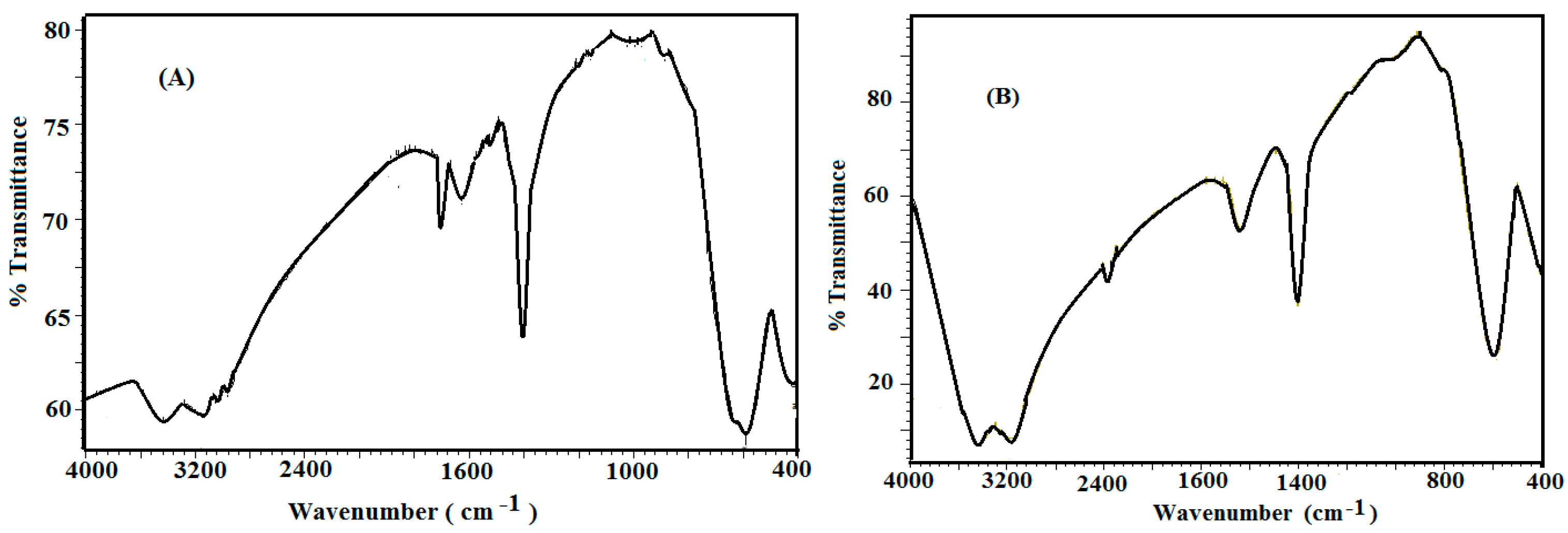 FTIR spectra of magnetite coated with (A) R-AN and (B) RK-AN amidoximes.