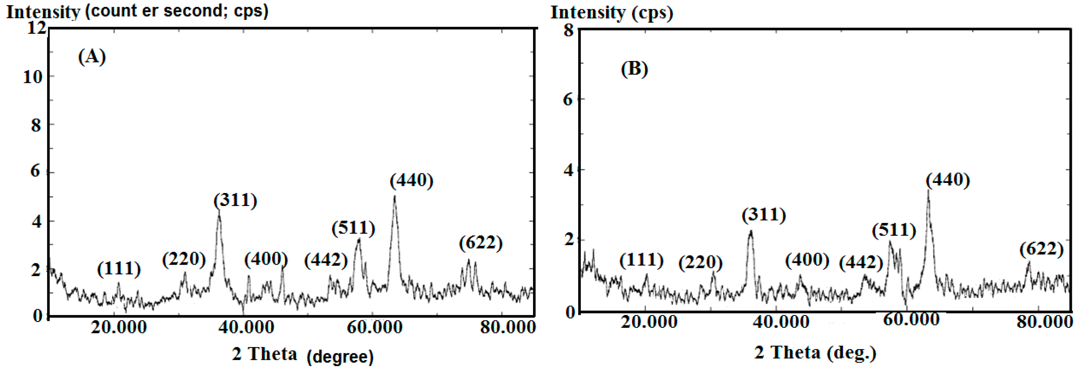 The structure and morphology of the magnetite capped with amidoxime derivatives of R-AN and RK-AN were characterized by FTIR and XRD analyses. In this respect FTIR spectra of Fe3O4 capped with amidoxime derivatives of R-AN and RK-AN were represented in Figure 4. In the previous work [26] with FTIR spectrum of uncapped iron oxides, not represented here for brevity, indicated the presence of α-Fe2O3 (hematite) beside magnetite nanoparticles. Figure 4 indicated that the presence of amidoxime derivatives of R-AN and RK-AN during the formation of magnetite prevent its air oxidation and produces Fe3O4 nanoparticles without any contamination of other iron oxides. This observation was confirmed by the appearance of a strong absorption band at 576 cm−1 which was assigned to the Fe–O vibration frequency of magnetite. Moreover, new absorption band at 1745 cm−1 for R-AN amidoxime (Figure 4A) indicated the formation of an ester link between COOH of R-AN amidoxime and OH of magnetite. The appearance of the band arises at 1652 cm−1 corresponding to the C=N stretching vibrations of amidoxime groups. The presence of absorption bands around 2865 and 2940 cm−1 corresponded to symmetrical and asymmetrical of CH2 stretching vibrations of the rosin hydrophenancerene ring. A broad absorption bands was found around 3299 and 3450 cm−1 that attributed to stretching vibration of hydroxyl groups and NH2 in the amidoxime derivatives of R-AN and RK-AN molecules. Consequently, these FT-IR spectra provided supportive evidence that amidoxime derivatives of R-AN and RK-AN attached to Fe3O4 nanoparticles via the interaction between magnetite and C=N, OH and NH2 groups of amidoxime derivatives of R-AN and RK-AN.
