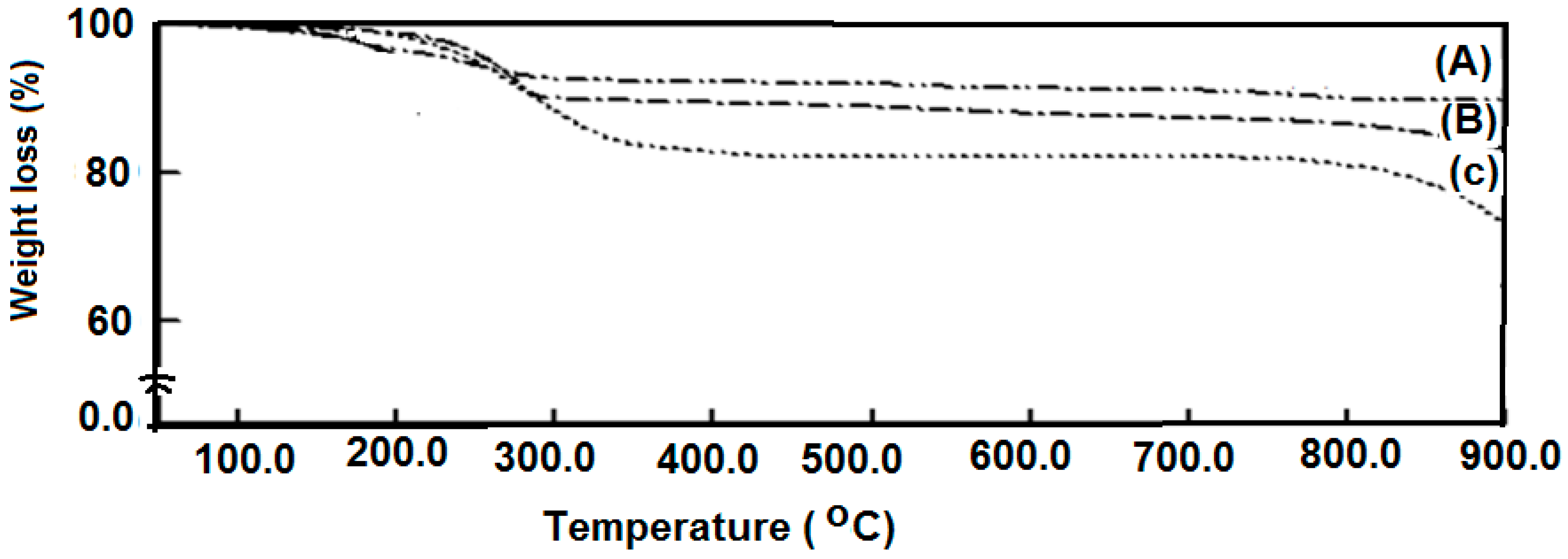 Thermogravimetric thermograms of (A) magnetite; (B) magnetite coated with RK/AN and (C) magnetite coated with R/AN amidoximes.