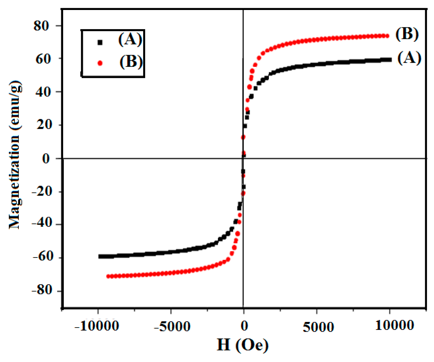 VSM magnetization curves of magnetite coated with (A) R-AN and (B) RK-AN amidoximes.