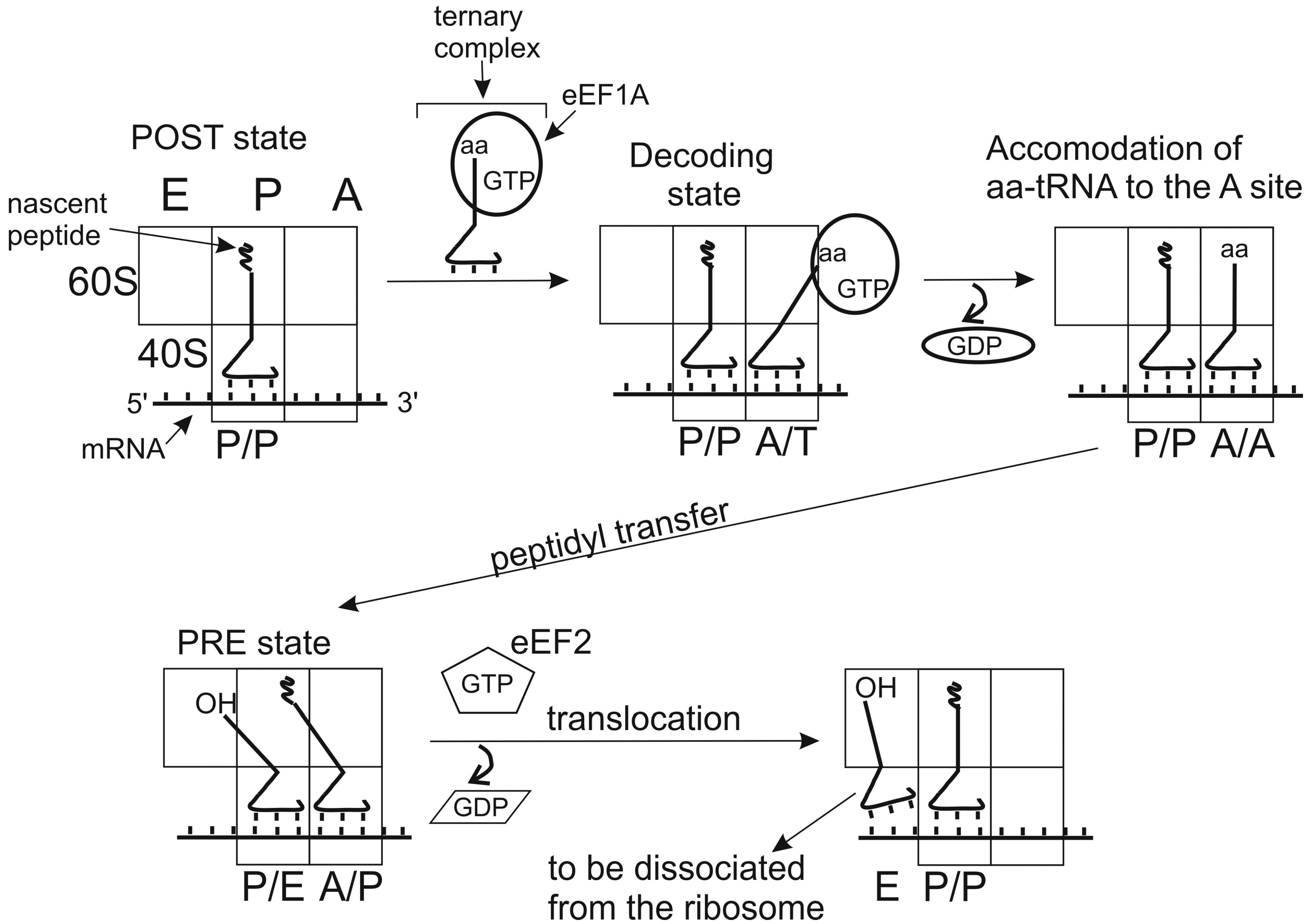 Simplified schematic representation of classical and hybrid states adopted by tRNAs in the course of the elongation cycle on the 80S ribosome. Initially, the P site is occupied with peptidyl tRNA and the A site is free (posttranslocational state, POST). Aminoacyl-tRNA is delivered to the A site within the ternary complex with eEF1A and GTP. If the aa-tRNA is cognate to the mRNA codon bound at the A site, codon-anticodon interaction takes place (decoding). This triggers GTP hydrolysis by eEF1A, which in turn leads to alteration of the factor’s conformation, dissociation of the eEF1•GDP from the ribosome and accommodation of the aa-tRNA to the A site. As the result, the acceptor end of the aa-tRNA becomes free and appears at the peptidyl transferase center, allowing fast transfer of the nascent peptide chain to the A site bound aa-tRNA (transpeptidation). After this, the acceptor end of the A site tRNA spontaneously moves to the P site (hybrid A/P state) and the acceptor end of the deacylated P site tRNA to the E site (P/E state); the ribosomal complex formed corresponds to the pretranslocational (PRE) state. Binding of ribosomal GTPase eEF2 to the PRE complex promotes translocation of the tRNAs with the bound mRNA codons, which results in formation of the new POST state, where deacylated tRNA is bound at the E site before it leaves the ribosome and the A site is ready to accept aa-tRNA cognate to the next mRNA codon.